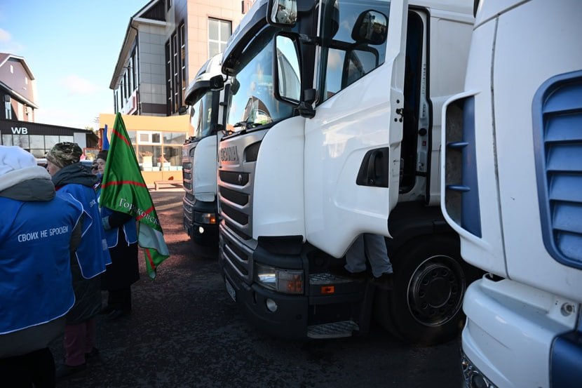 В составе конвоя — десятки единиц транспорта, в том числе грузовые машины и внедорожники, а также гуманитарная помощь, подготовленная специально к осеннее-зимнему сезону.