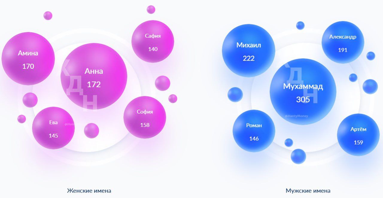 305 мальчиков получили имя Мухаммад и 172 девочек назвали именем Анна. Уже третий год подряд имя Мухаммад лидирует в списке самых популярных имён в ХМАО.