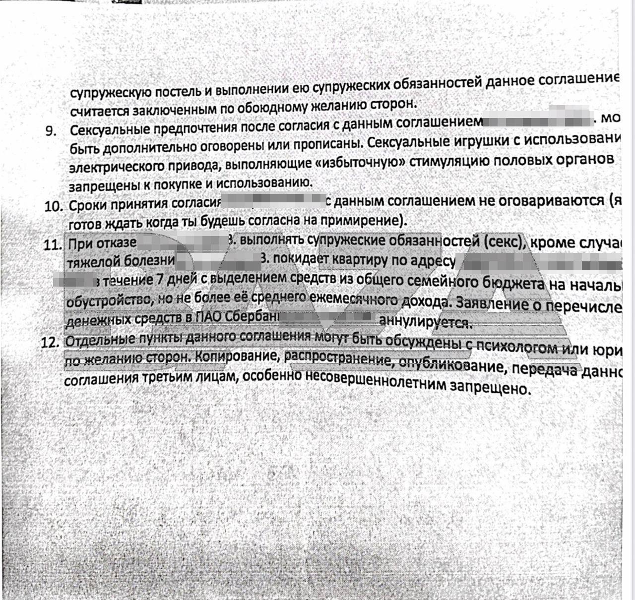 Как выяснила «База», Мария и Сергей (имена изменены) прожили вместе долгих 24 года в браке (сейчас обоим около 45 лет). У пары двое детей, имущество в разных регионах и большие проблемы в отношениях из-за патриархального абьюза. Сергей работал в сфере образования и любил всеми управлять. Мария не выдержала и решила развестись. Сергей не хотел её отпускать и вскоре принёс «соглашение о примирении». Хоть и выглядело оно как тотальный сарказм, Мария утверждает, что примерно так на самом деле муж и видел их совместную идеальную жизнь.