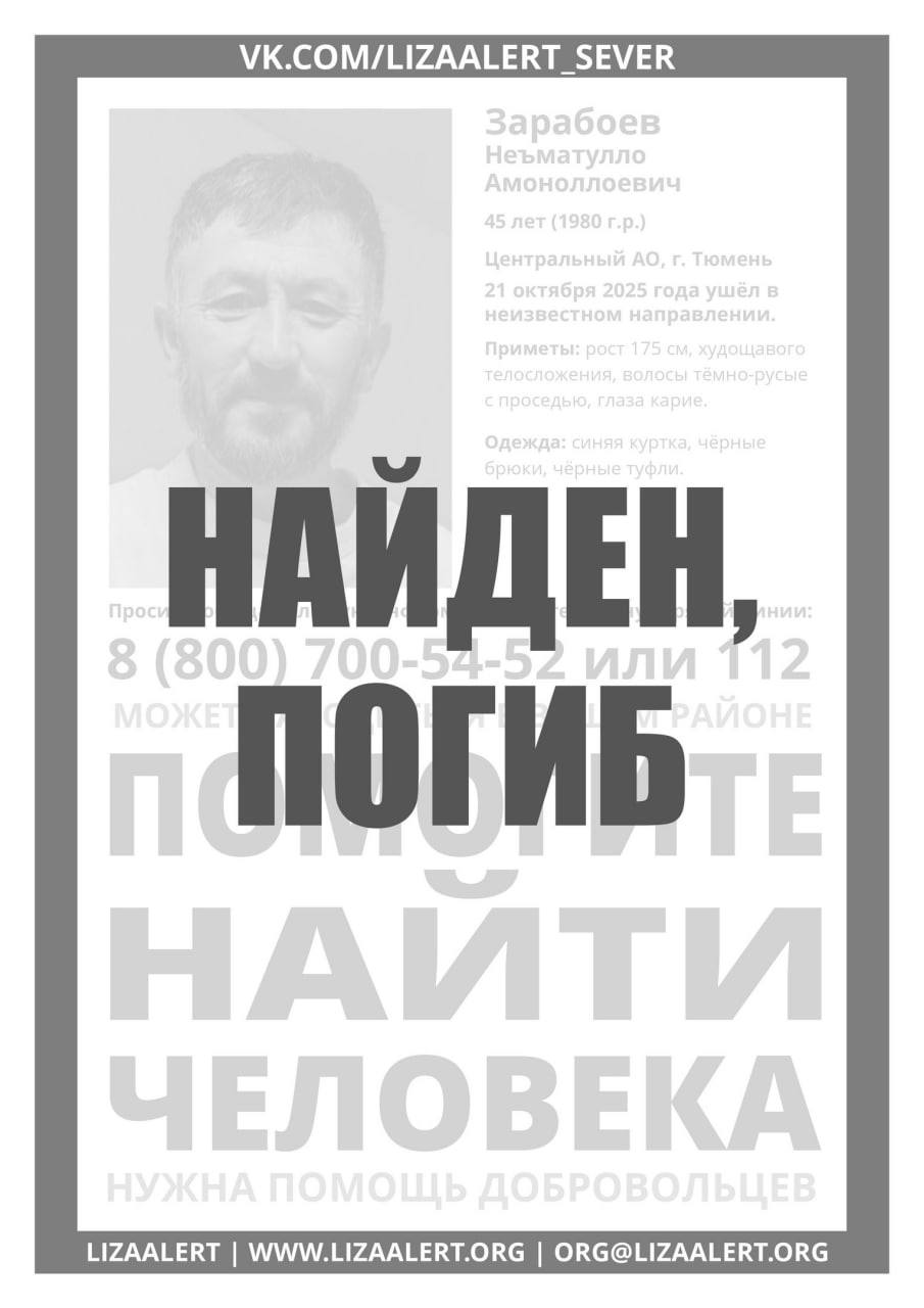 21 октября в Тюмени пропал Неъматулло Зарабоев. Накануне поисковики сообщили, что он погиб. О найденном теле рассказали в полиции