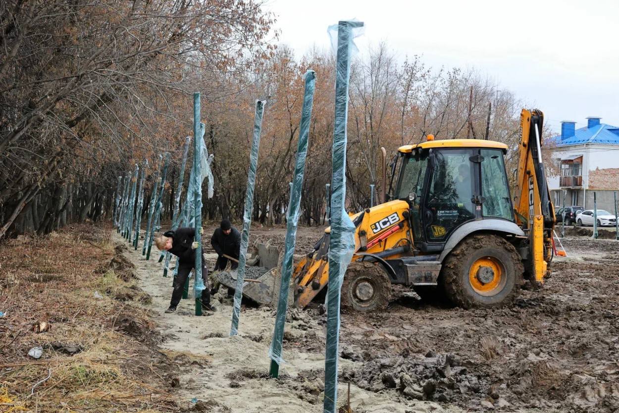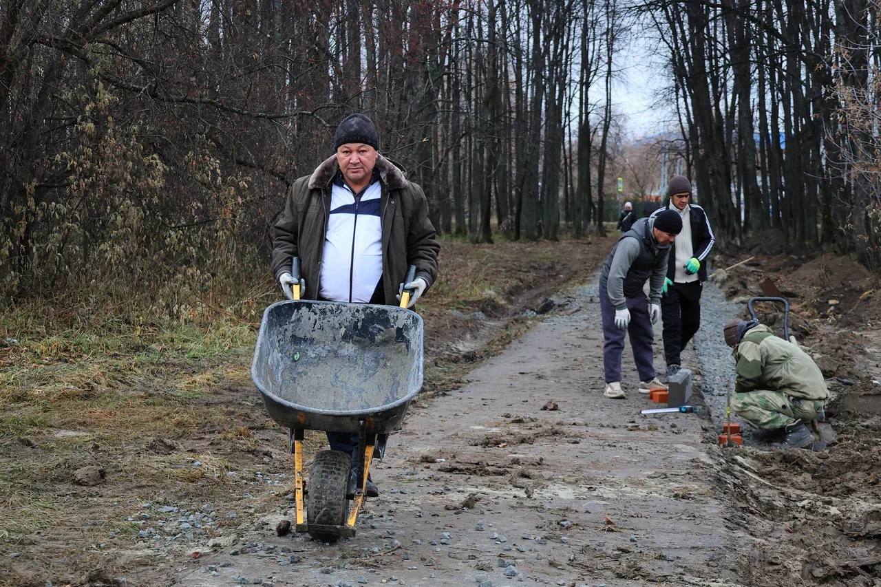 Начато устройство пешеходных дорожек и укладка бордюрного камня.