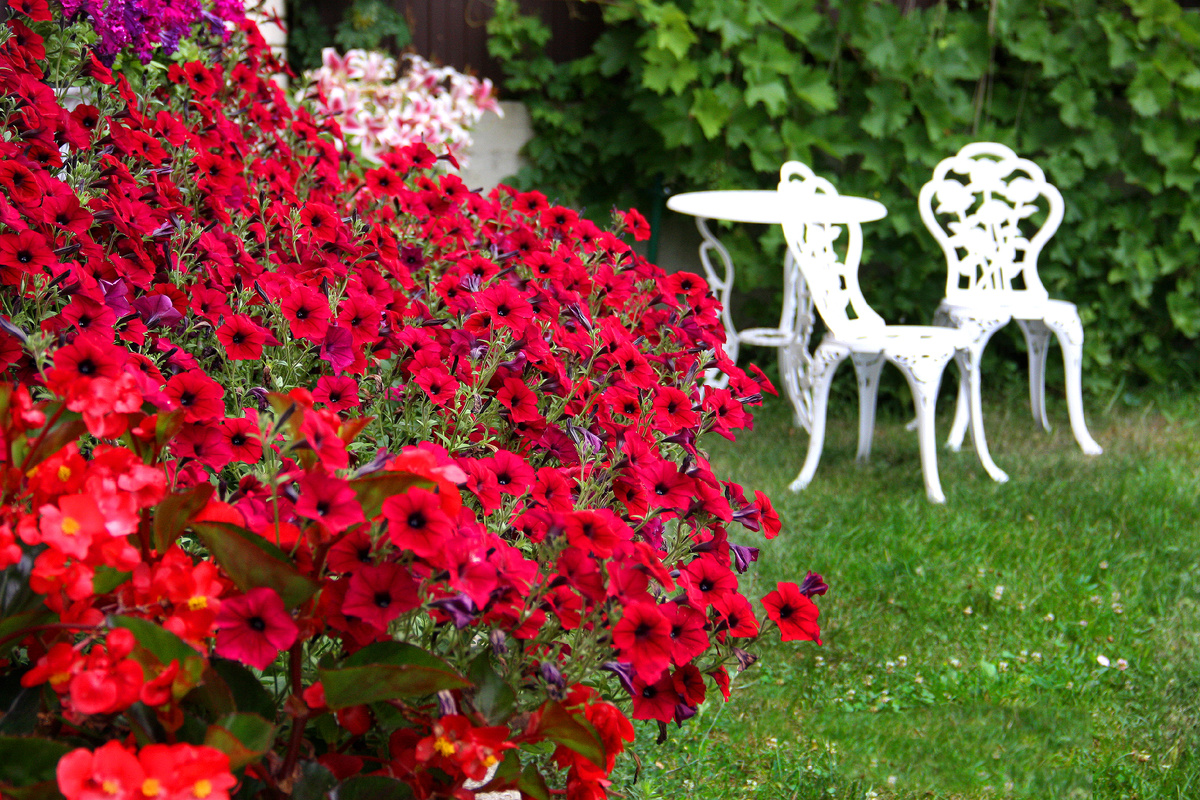 К тому же, не нужно быть ландшафтным дизайнером, чтобы заметить, что здесь отсутствует привычное для небольших участков размещение растений. Вместо центрального газона с периметром кустарников, в этом саду царит динамика и разнообразие ландшафта. Газон уютно примыкает к дому, а по краям его бордюры обрамляют цветные композиции на возвышении, где яркие петунии наполняют пространство живыми цветами.