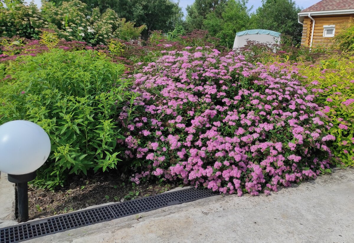 - Летом: японская спирея, Дугласа, белоцветковая и Бумальда, цветущие на новых побегах текущего сезона.