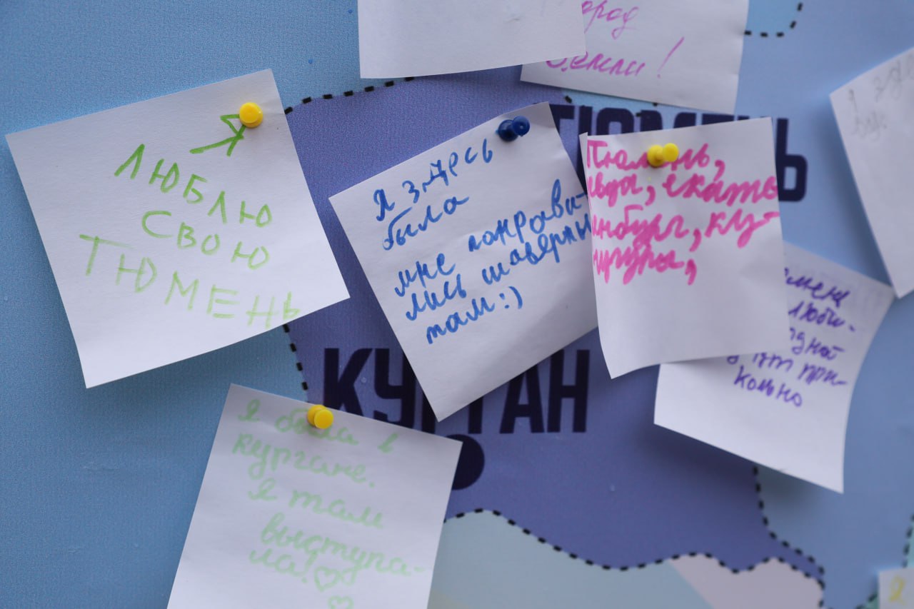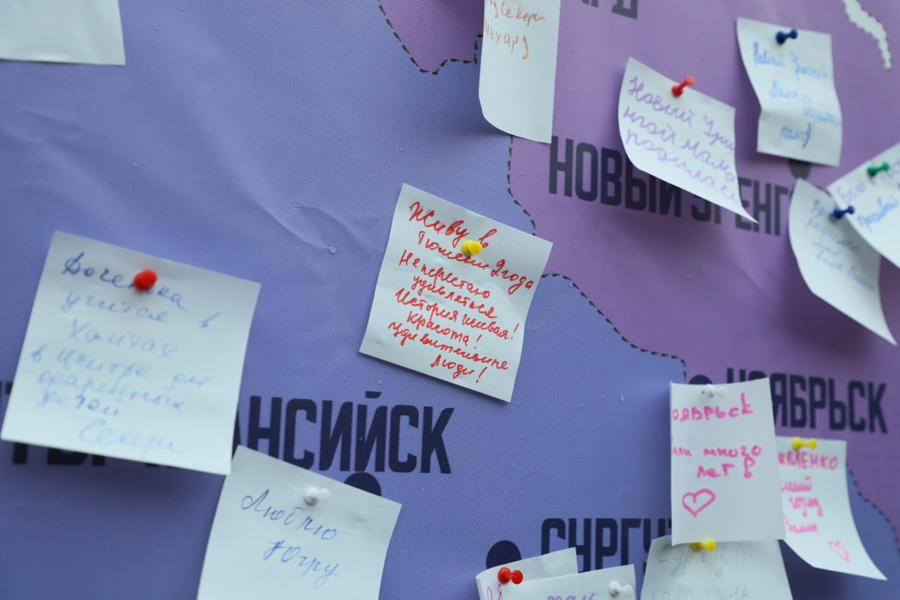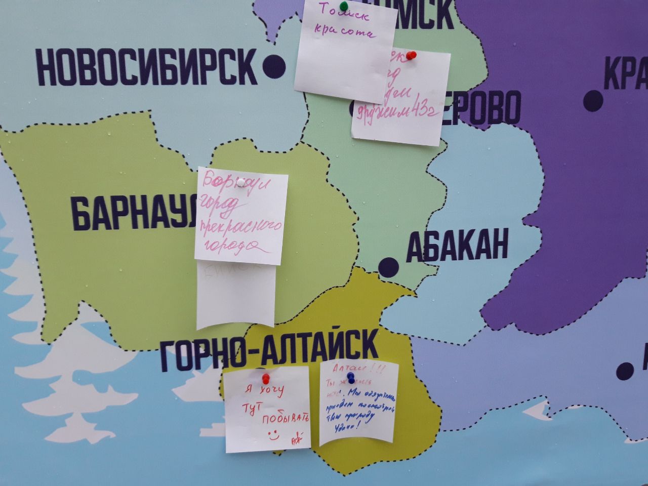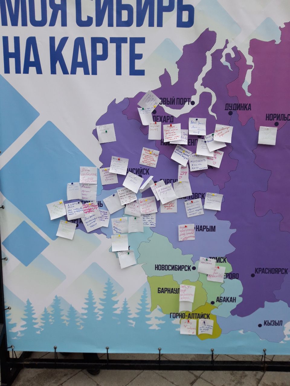 Со стороны улицы Советской была установлена карта Сибири с нанесёнными на неё названиями городов. Желающие могли на листочке написать причину любви к тому или иному городу и приколоть его на карту.