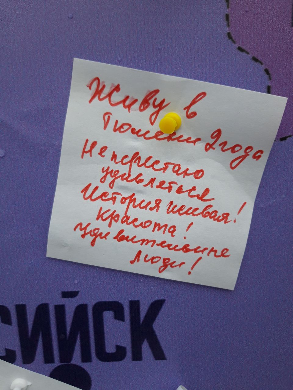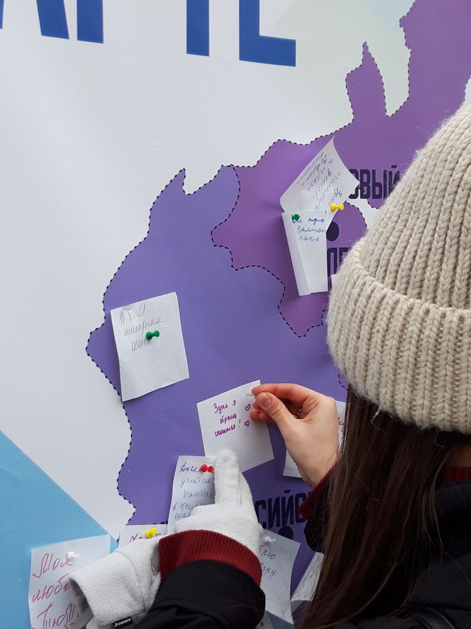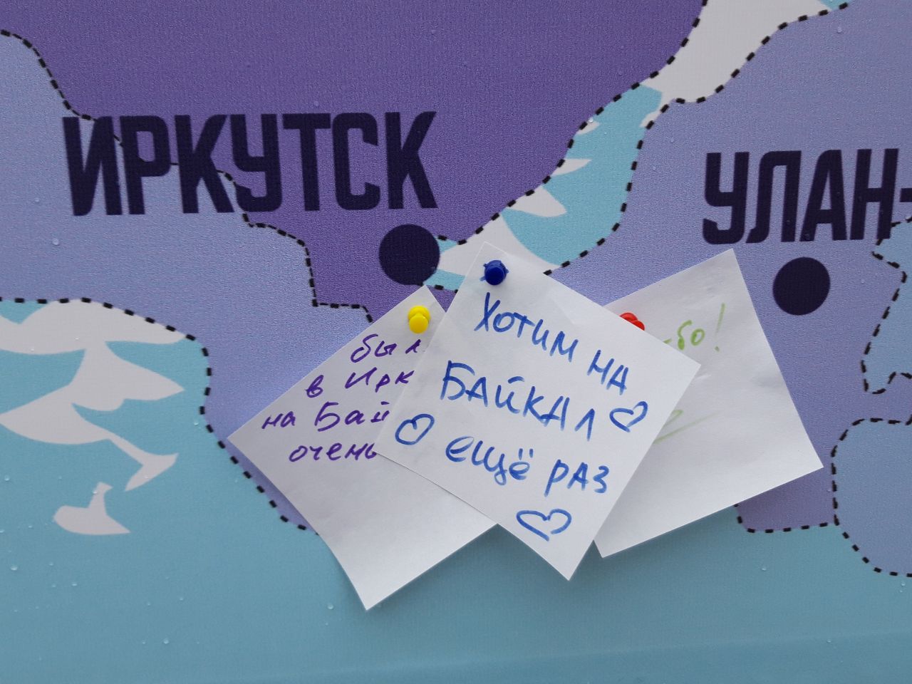 Со стороны улицы Советской была установлена карта Сибири с нанесёнными на неё названиями городов. Желающие могли на листочке написать причину любви к тому или иному городу и приколоть его на карту.