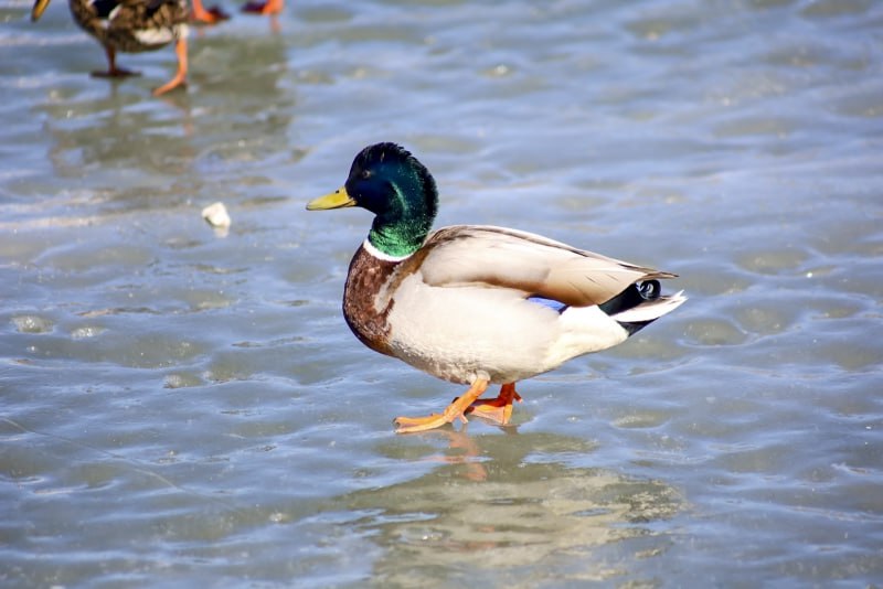 Птицы прекрасно переносят даже сильные морозы до –40 градусов благодаря плотным перьям и толстому слою жира. Главное условие выживания — наличие водорослей на дне водоёма.
