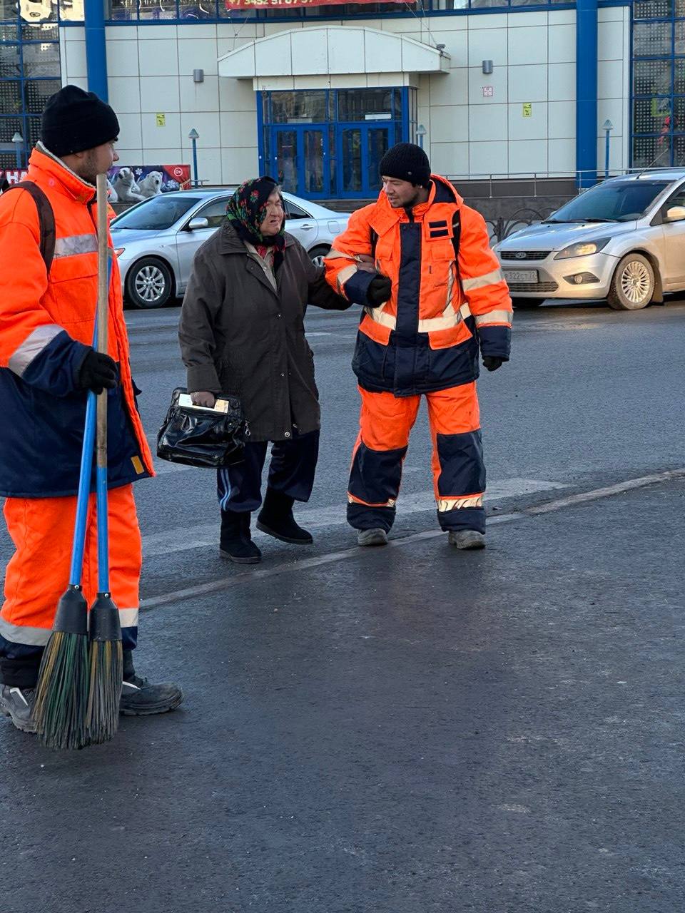 В Тюмени около цирка дорожные рабочие помогли пенсионерке перейти дорогу —