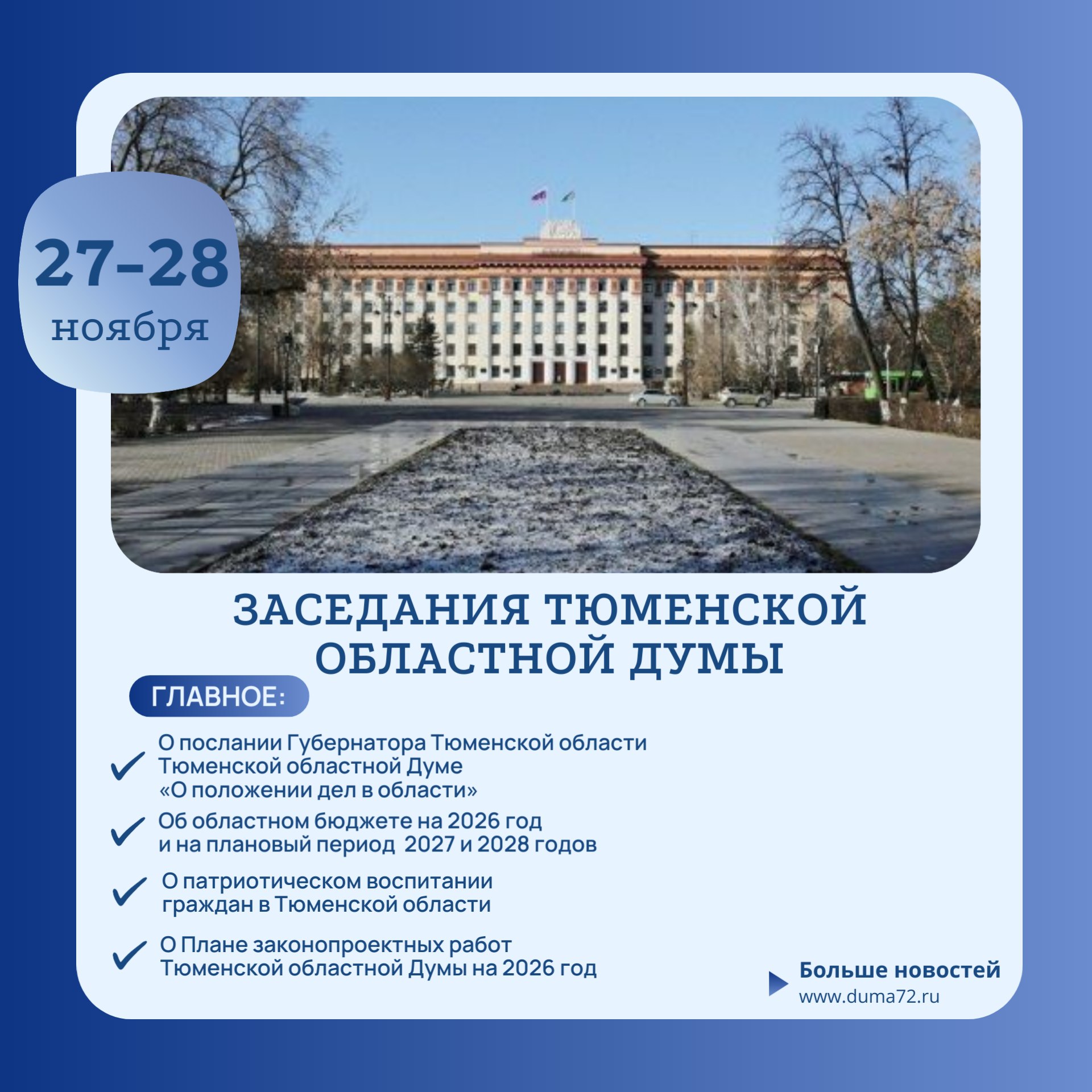27 и 28 ноября состоятся очередные 43 и 44 заседания Тюменской областной думы.