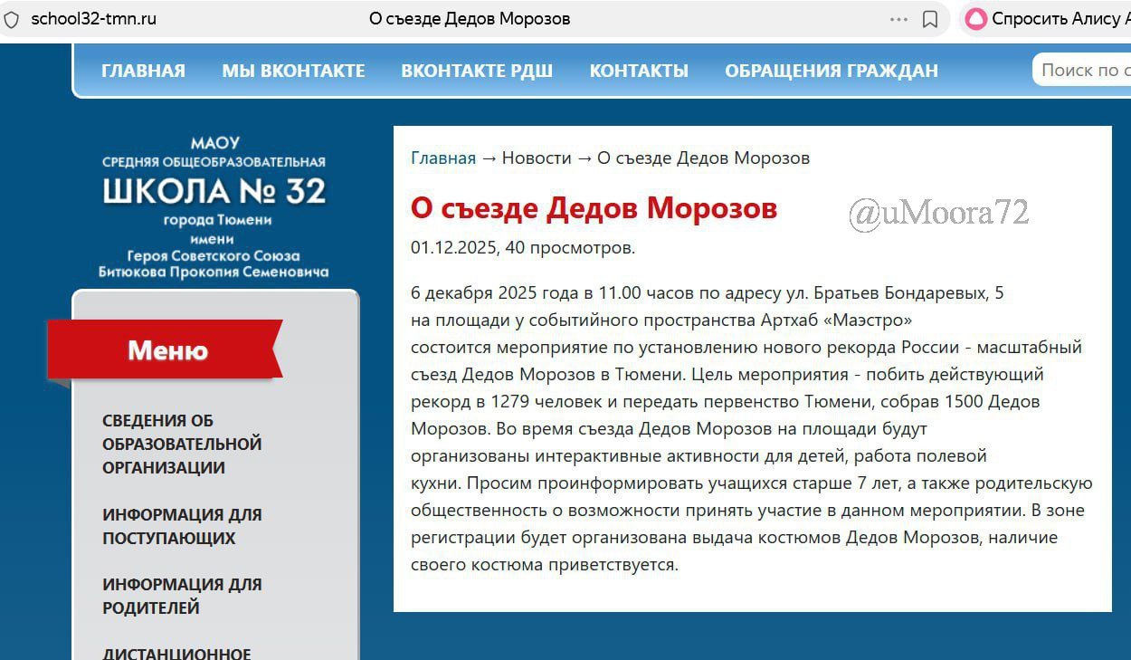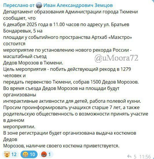 При этом на 6 декабря в Тюмени запланировано массовое мероприятие — съезд Дедов Морозов. Организаторы приглашают всех желающих, чтобы побить рекорд и собрать в одном месте более 1,5 тысяч участников. Жители в соцсетях скептически отнеслись к такой идее: «У нас, вроде как, всё очень плохо с ОРВИ, школьников перевели на дистант, но тут же проводят сборы детей на рекламную акцию для установления рекорда».