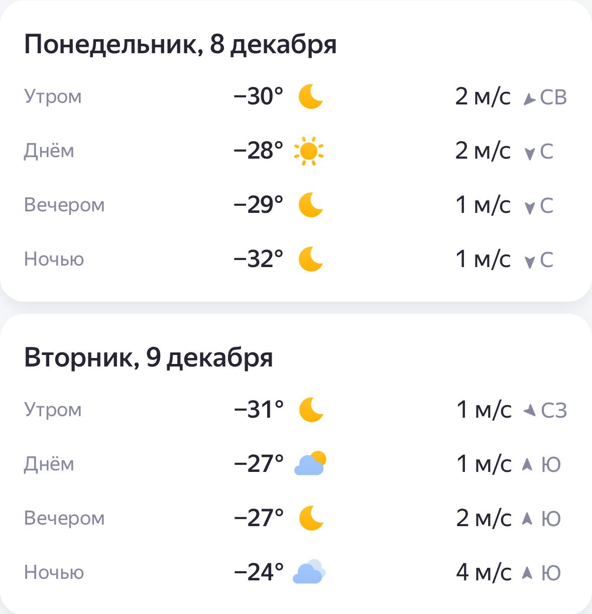 8 декабря в ночные часы до -32°, утром чуть-чуть теплее — до -30°! Днем ситуация слегка улучшится — до -28°