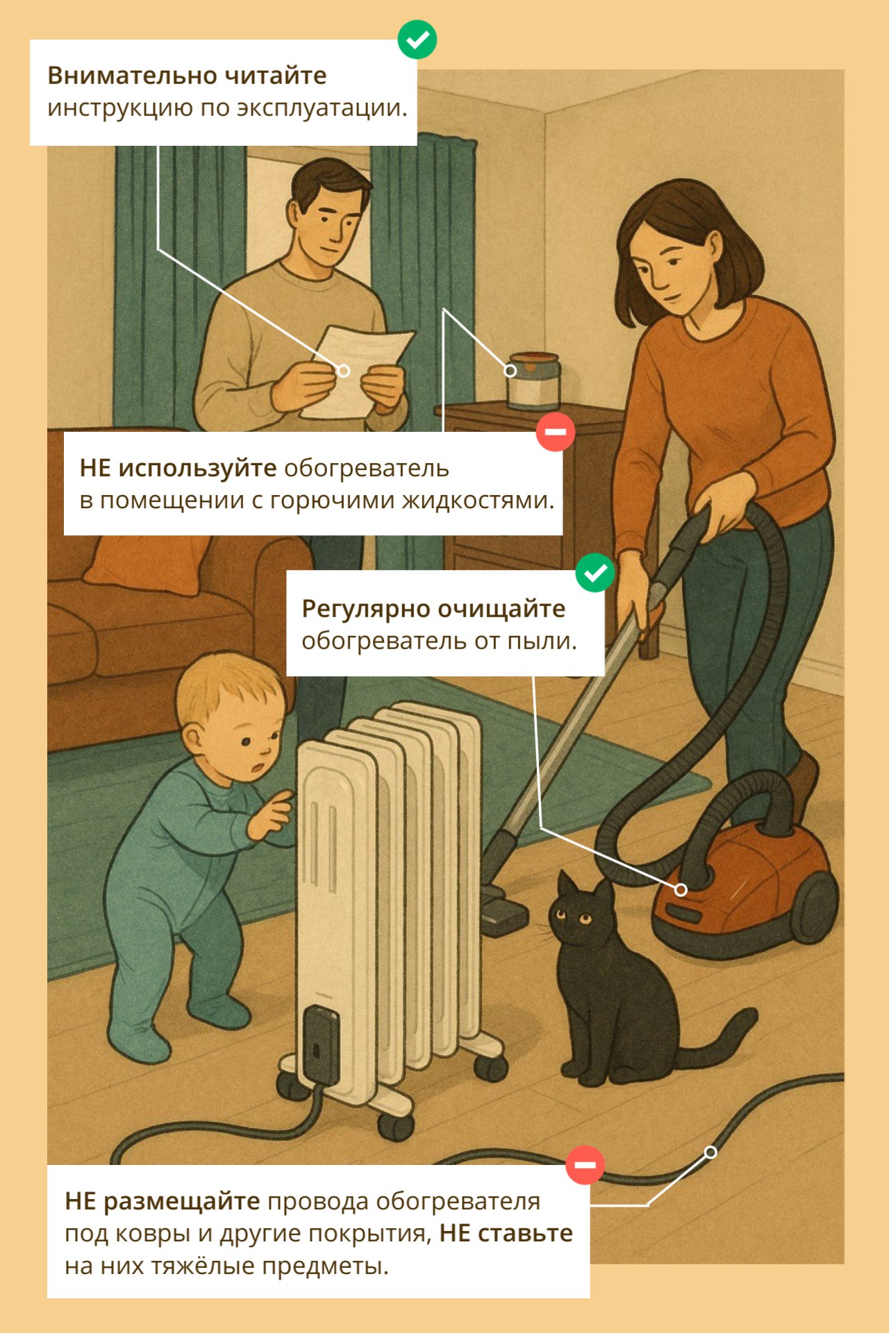 не размещайте обогреватели в непосредственной близости от мебели или штор;