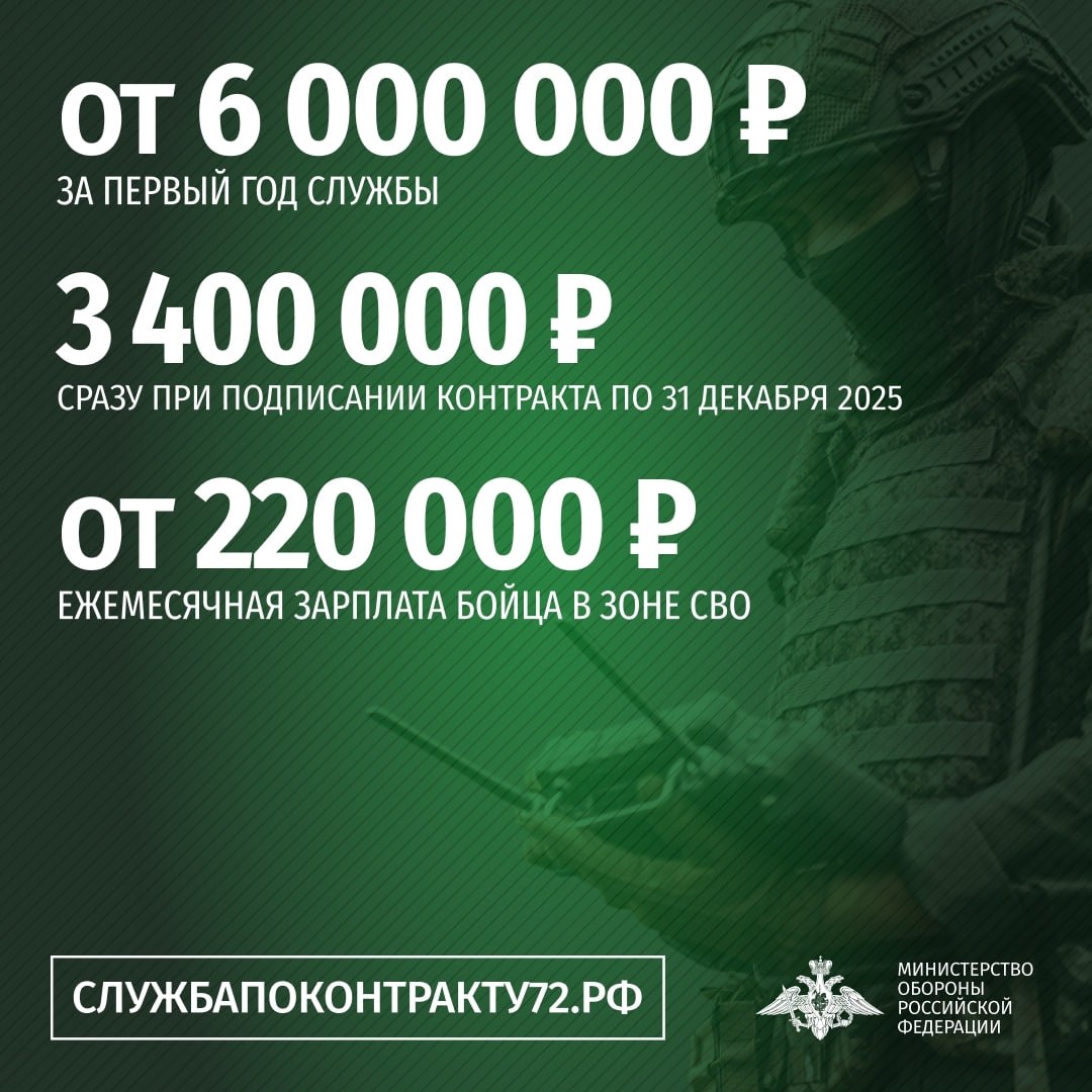 В Тюменской области при подписании контракта по 31 декабря размер выплат составляет 3 400 000 рублей сразу, за первый год службы — 6 000 000 рублей.