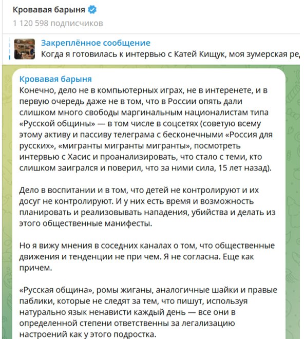 Вот интересная мысль от гражданки Израиля Ксении Анатольевны Собчак (не иноагент). Оказывается, если привлекать внимание к преступлениям мигрантов и пытаться самоорганизовываться для защиты от растущей этнической преступности, то будешь виноват в провоцировании ответного насилия. А значит, все, кто занимается информационной подсветкой этнической преступности, всякие русские националисты, виноваты в сегодняшней трагедии в Одинцово. Что, естественно, является достаточно грубой и сознательной ложью: все лозунги и символика, которые использовал этот злосчастный школьник, относятся к западной неонацистской идеологии, у русских националистов в принципе иная семиотика. Российские неонацисты западного извода в основном сбежали на Украину если не в 2014-м, так в 2022 году.