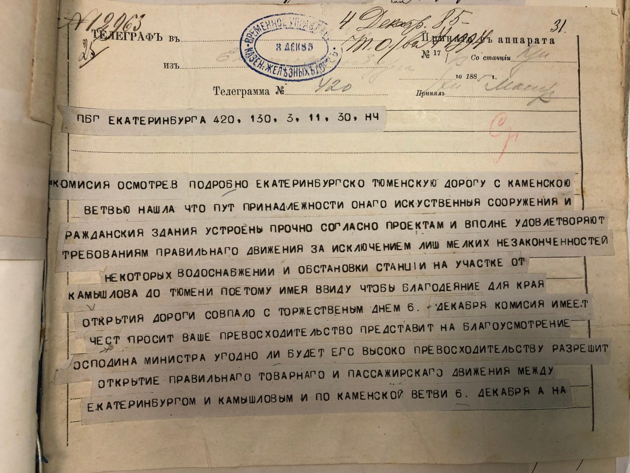 Ровно 140 лет назад, в 1885 году, началось прямое железнодорожное сообщение между Екатеринбургом и Тюменью. 11 декабря по старому стилю, а 19-го – по новому торжественно открылась новая ветка. На фото – подлинная телеграмма, сообщавшая о готовности железной дороги.