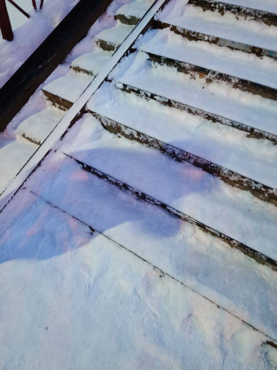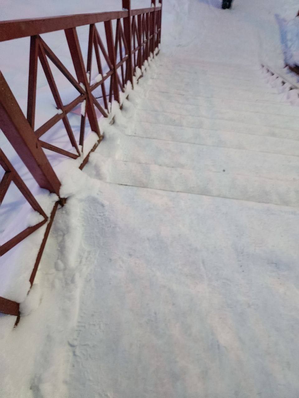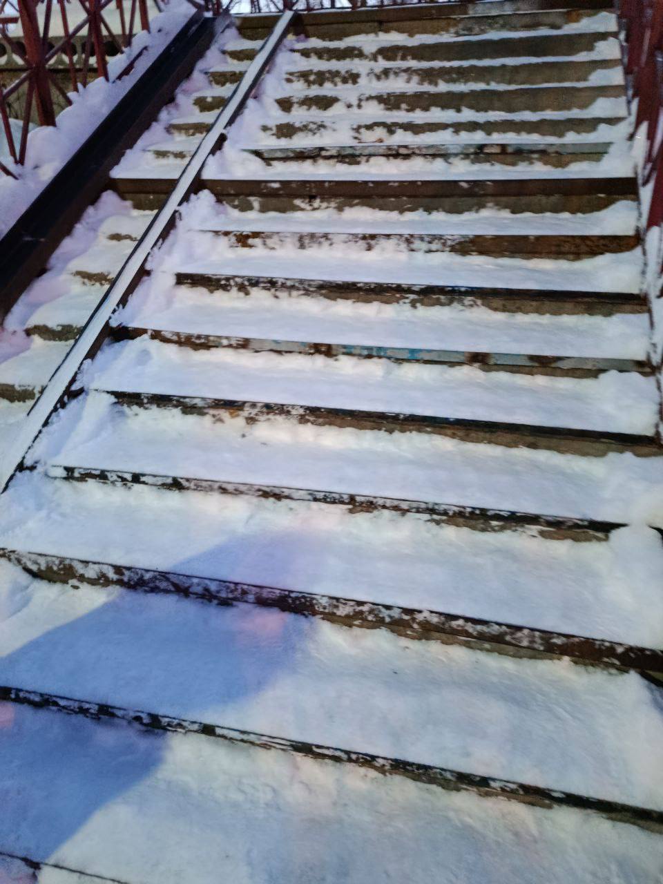 «Пешеходный переход через ЖД дорогу в районе Маяка. Не очищенная лестница от слова совсем, только притоптано пешеходами.»