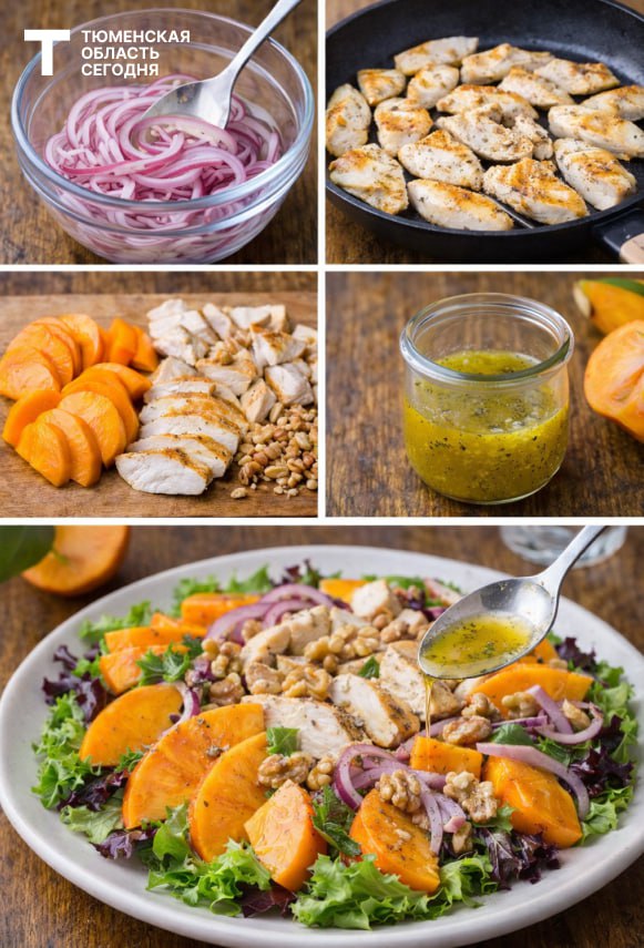 • Выкладываем на блюдо листья салата, сверху хаотично курицу, хурму, орехи и добавляем заправку