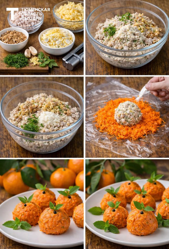 • Чтобы создать вид настоящих фруктов, добавьте черные точки от мандаринов или просто возьмите черный перец горошком и воткните в мандарины. Для создания листиков используйте мяту.