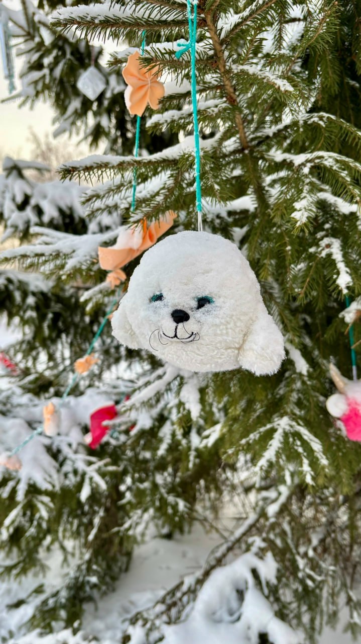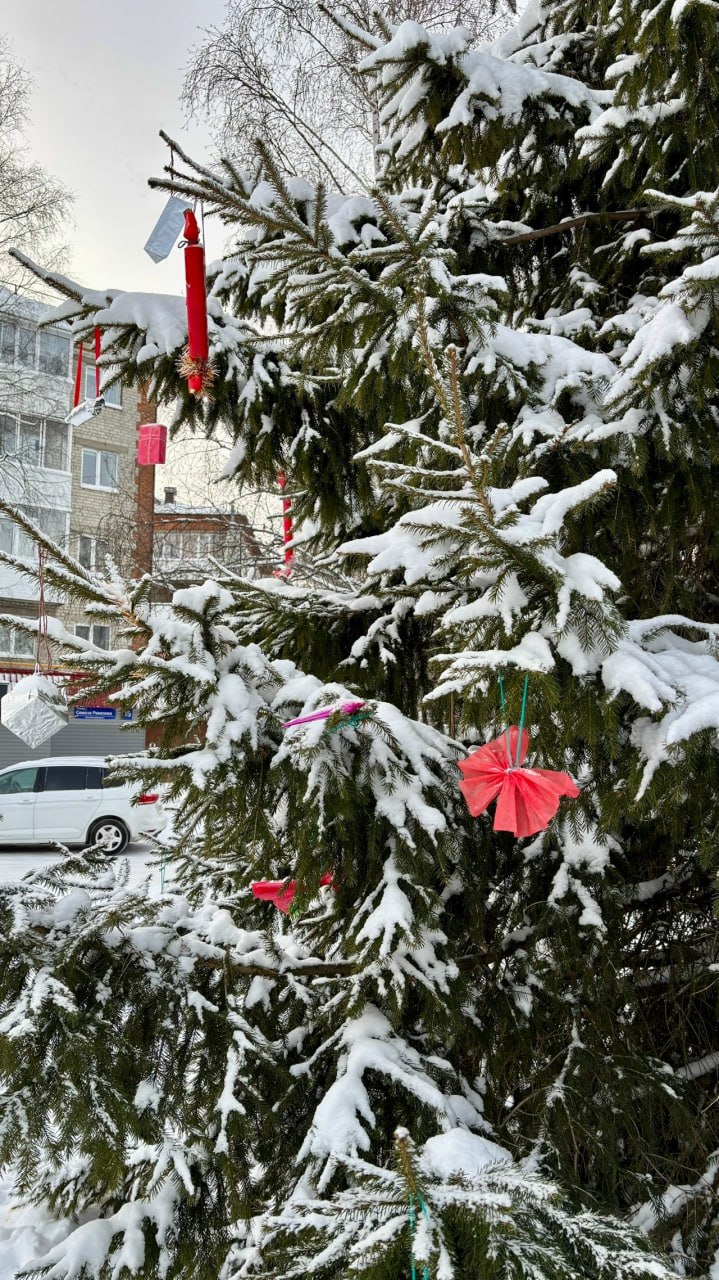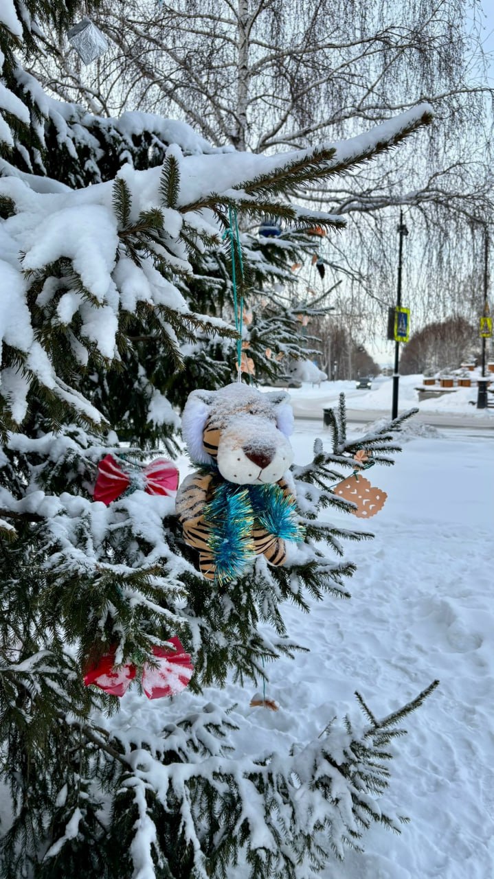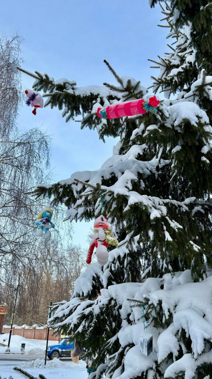 Недалеко от дома по адресу Семёна Ремезова, 46 живая городская красавица засияла по-особенному — её украсили самодельными и мягкими игрушками.