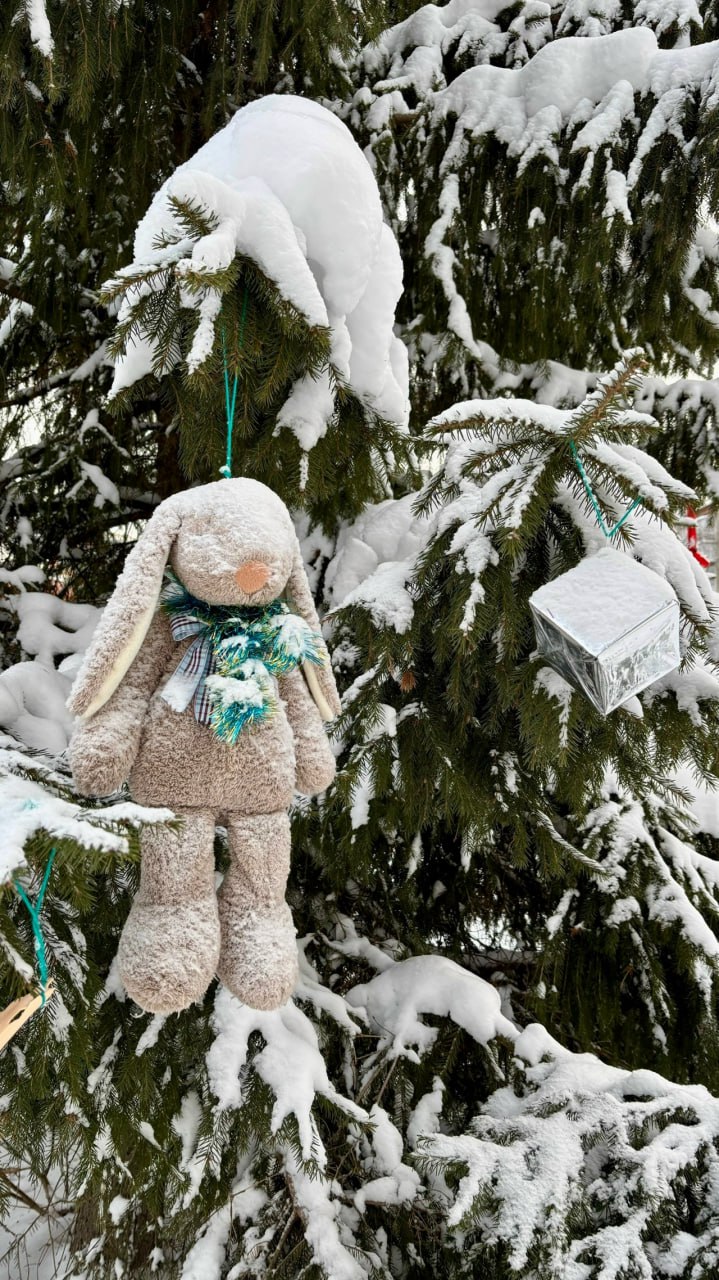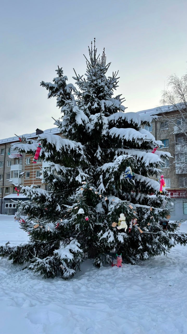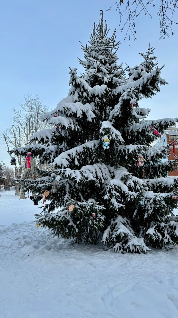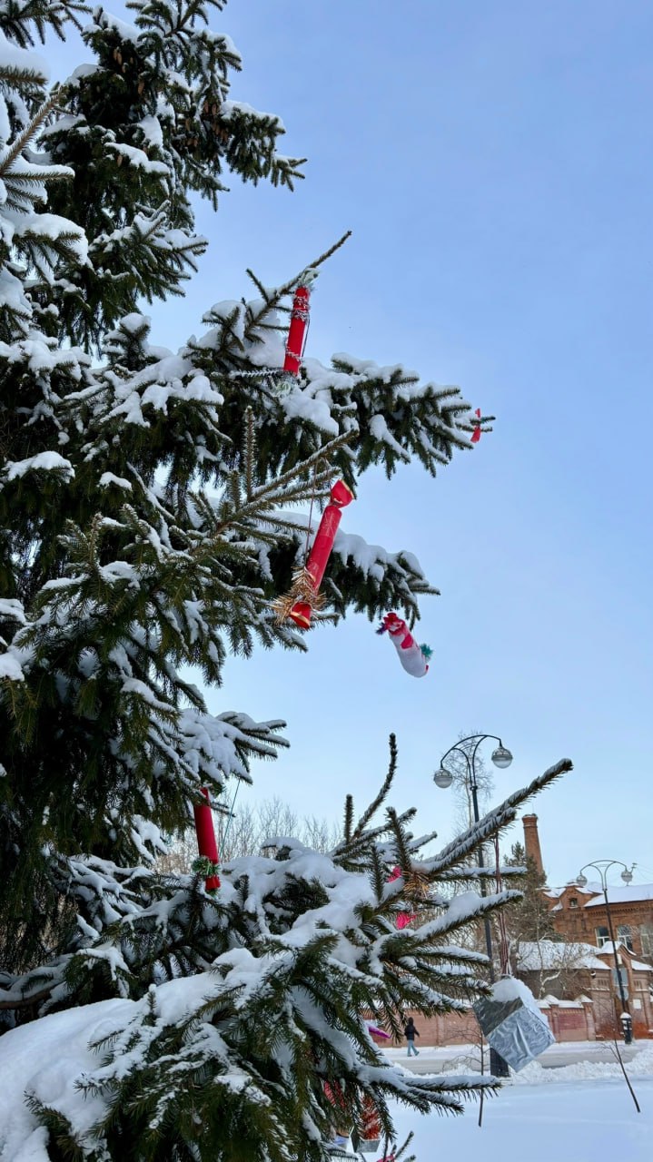 Недалеко от дома по адресу Семёна Ремезова, 46 живая городская красавица засияла по-особенному — её украсили самодельными и мягкими игрушками.
