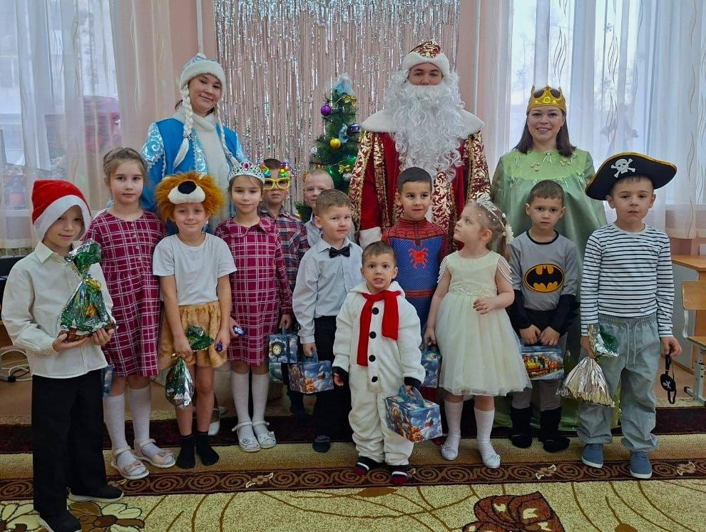 По доброй традиции, ребята вместе зажги огни на нарядной ёлке, закружились в веселом хороводе и подарили друг другу задорный детский мех.