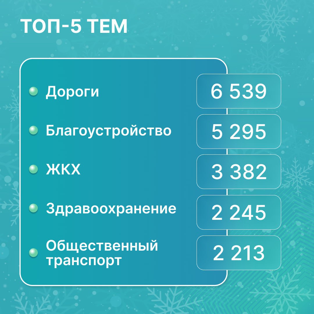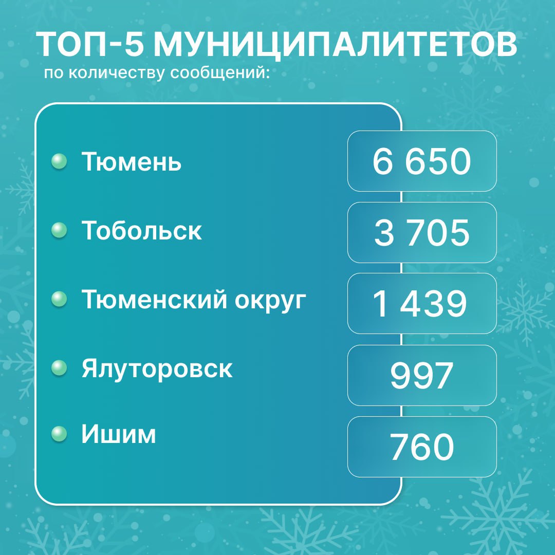 В топ-5 тем, по которым обращались жители, - дороги, благоустройство, ЖКХ, здравоохранение, общественный транспорт. Больше всего сообщений поступило из Тюмени, Тобольска, Тюменского округа, Ялуторовска и Ишима.