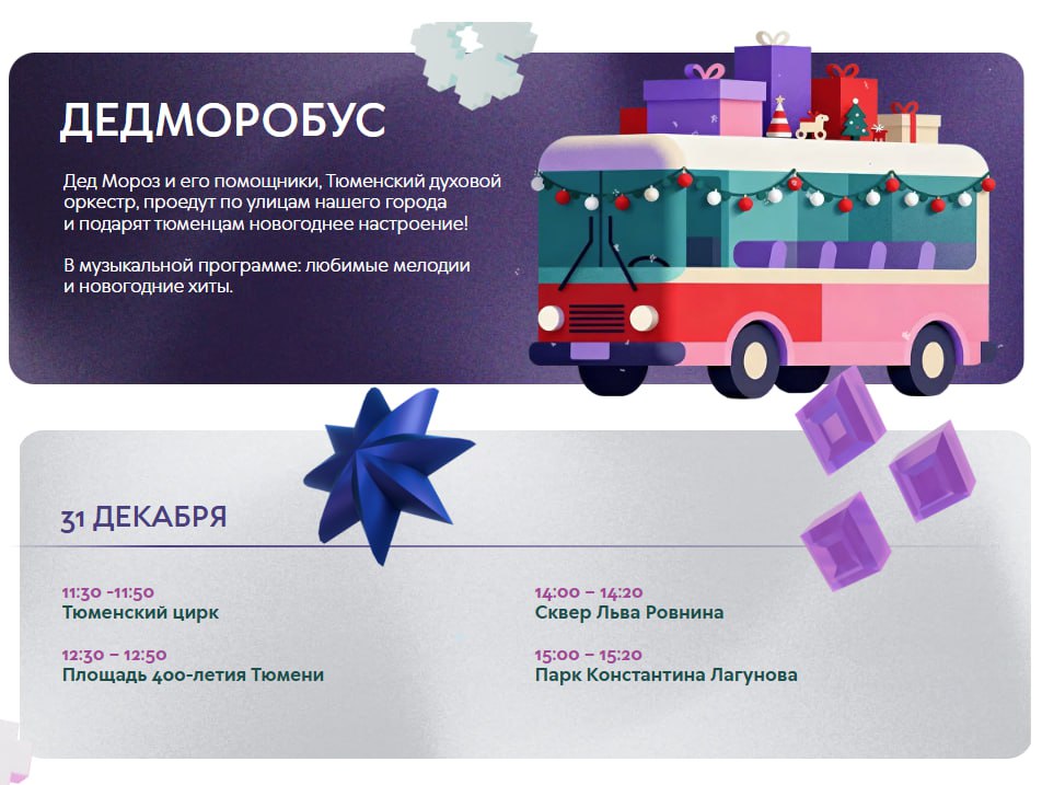 О чём речь? О Дедморобусе, который уже не в первый раз вместе с Тюменским духовым оркестром привезёт в городские парки, скверы и площади самое новогоднее настроение!