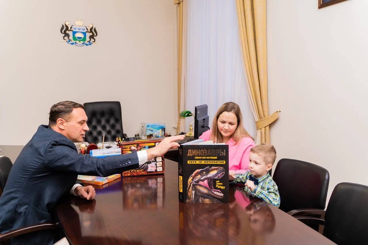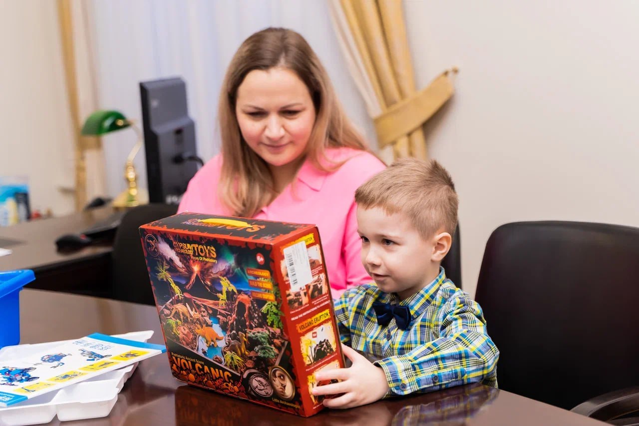 Подарки пятилетнему Степану из Тюмени вручил заместитель губернатора Тюменской области Андрей Пантелеев - конструктор, детский археологический набор и 3D-ручку.