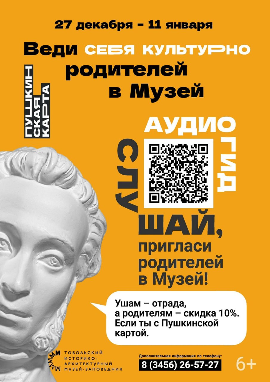По 11 января 2026 г. в Тобольском историко-архитектурном музее-заповеднике пройдёт Всероссийская акция «Веди родителей в музей» для владельцев Пушкинской карты.