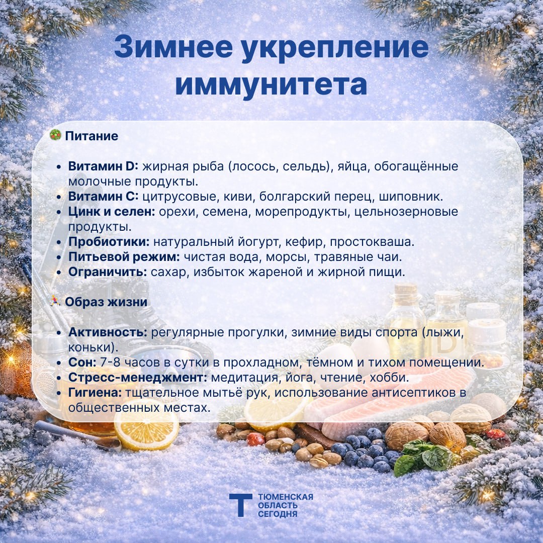 Мы собрали для вас главные правила, которые помогут укрепить здоровье зимой. Сохраняйте карточку, делитесь с близкими и проводите Новый год полными сил!