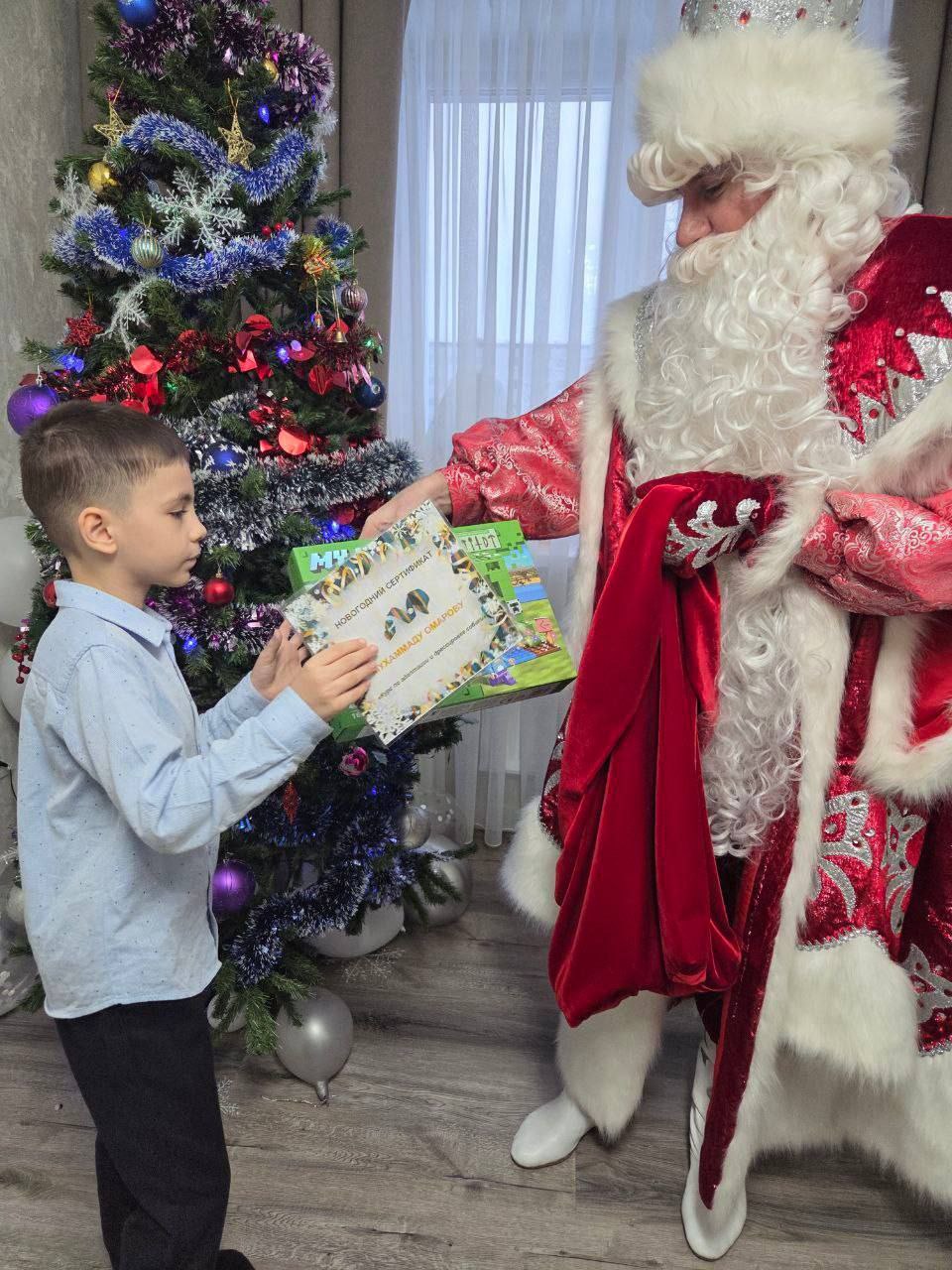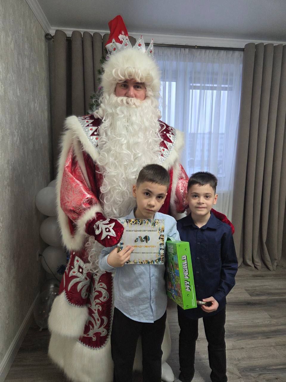 Подарки доставлены двум школьникам из Нового Уренгоя Ямало-Ненецкого автономного округа: 8-летний мальчик получил из рук Деда Мороза сертификат на курс дрессировки для его любимой собаки, а 14-летний юноша - беспроводные наушники.