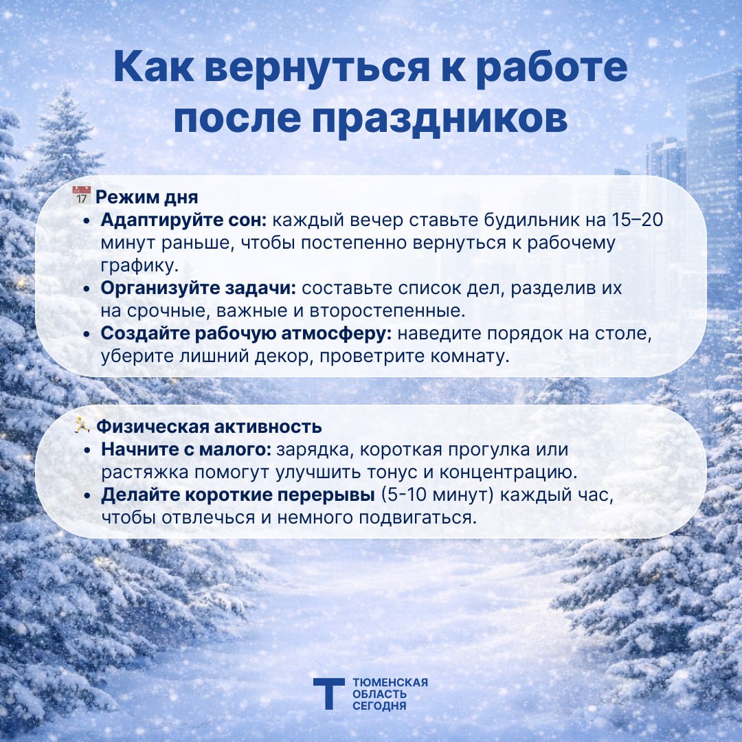 Постепенно возвращаемся в ритм! Чтобы первые рабочие дни после праздников прошли легче и продуктивнее, мы собрали для вас простые советы в карточках.