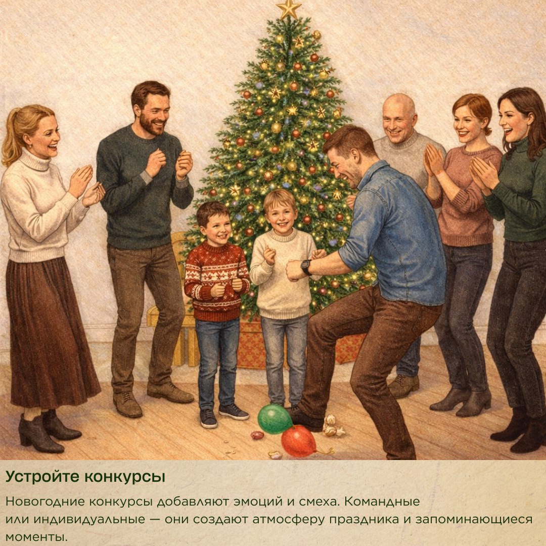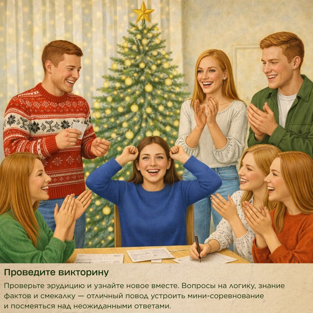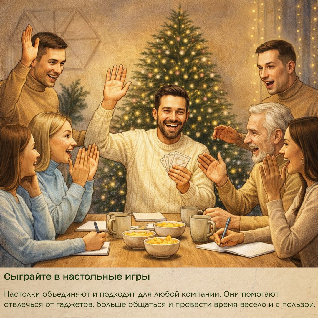 В карточках собраны идеи, которые помогут разнообразить новогодние вечера — всё, чтобы смех, азарт и хорошее настроение не заканчивались