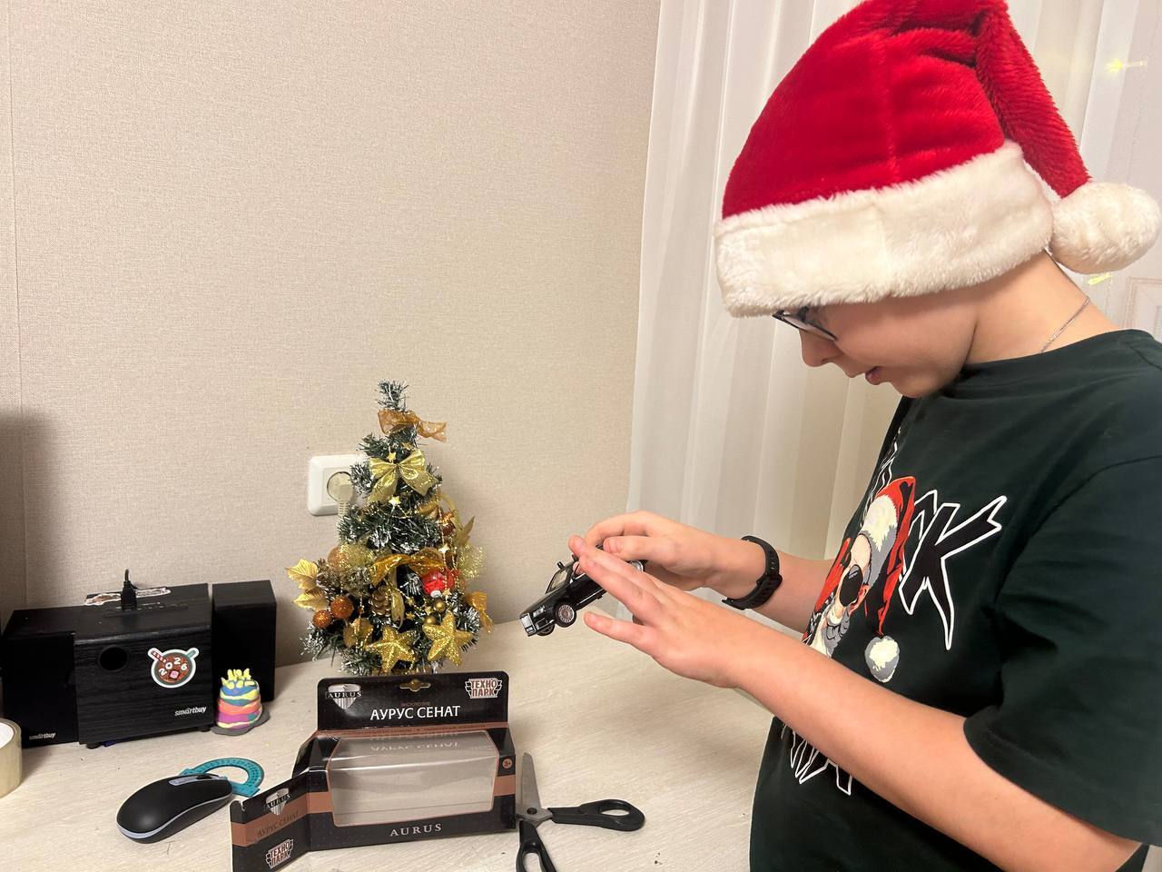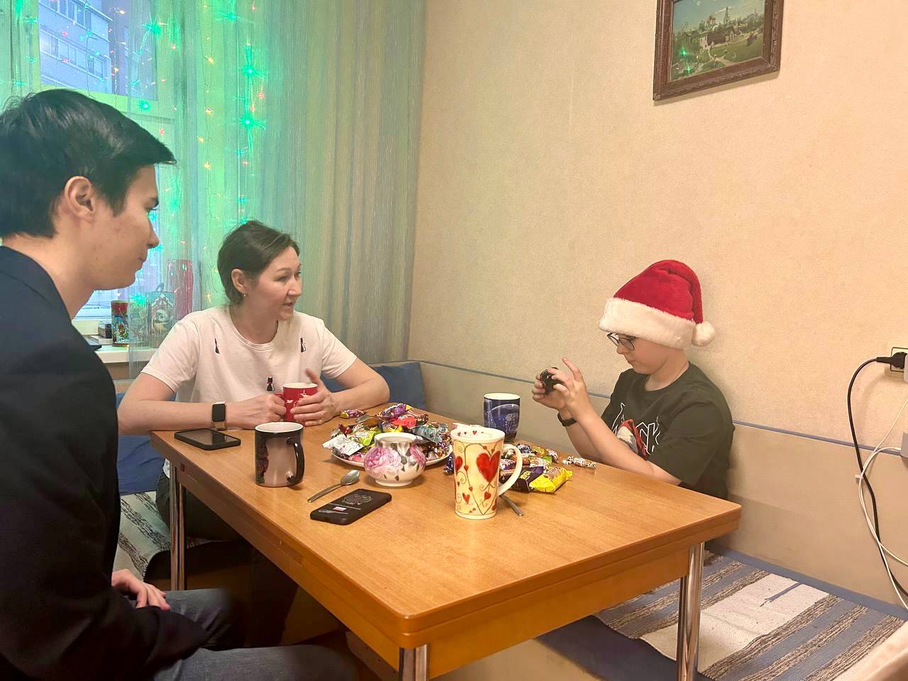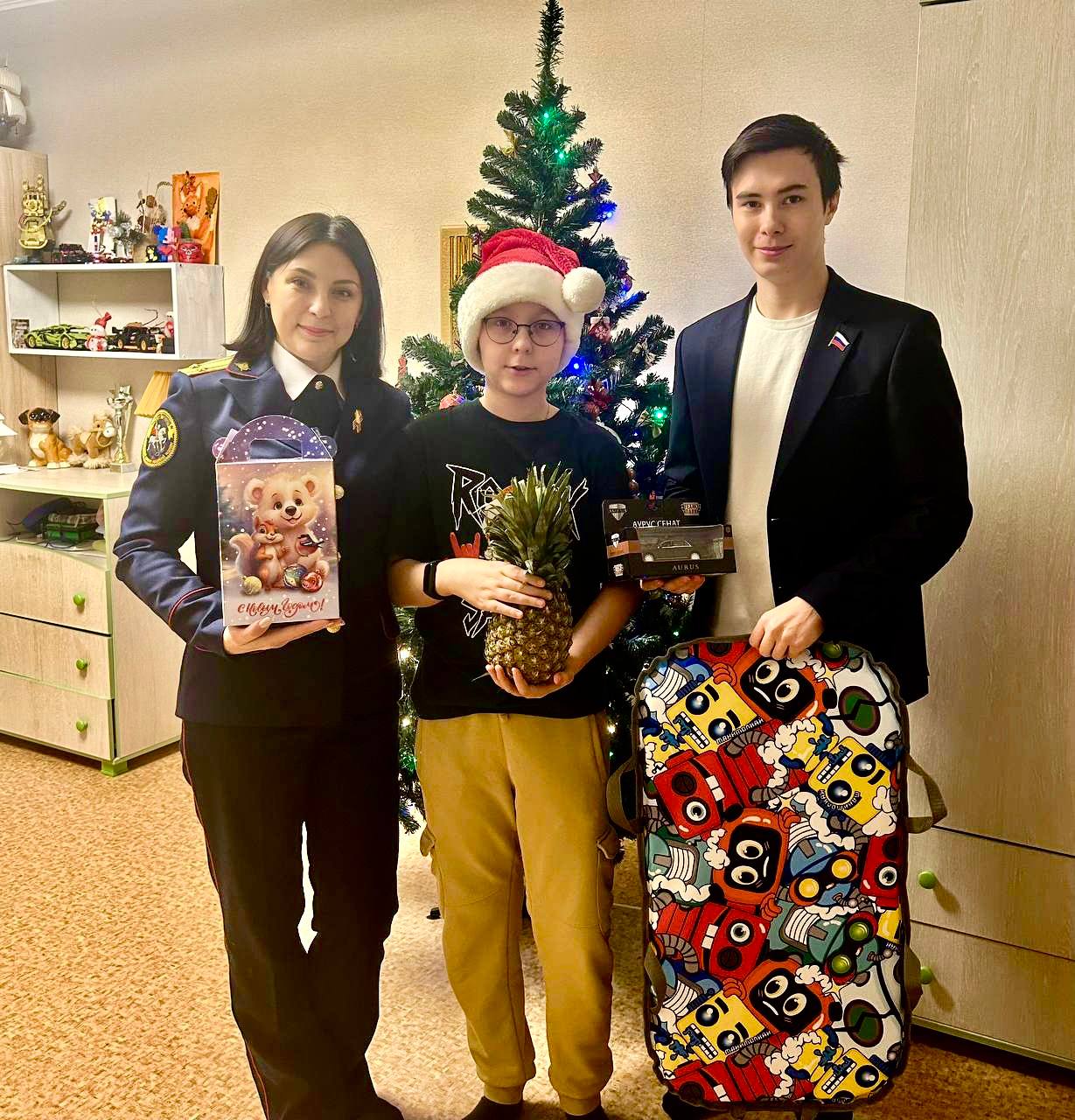 Помощник руководителя следственного управления СК России по Тюменской области Оксана Александровна Абрамовская и руководитель Регионального отделения Молодёжного союза «Юный следователь» Иван Николаевич Южаков сняли шар с новогодней ёлки и стали исполнителями желания для 10-летнего Михаила, который загадал «подарок-сюрприз». Мальчик мечтает стать президентом страны, представители ведомства пожелали ему исполнения мечты и преподнесли настоящую модель автомобиля президента Российской Федерации, сладкий подарок и мягкую ледянку. Подарки очень порадовали Михаила и его маму.
