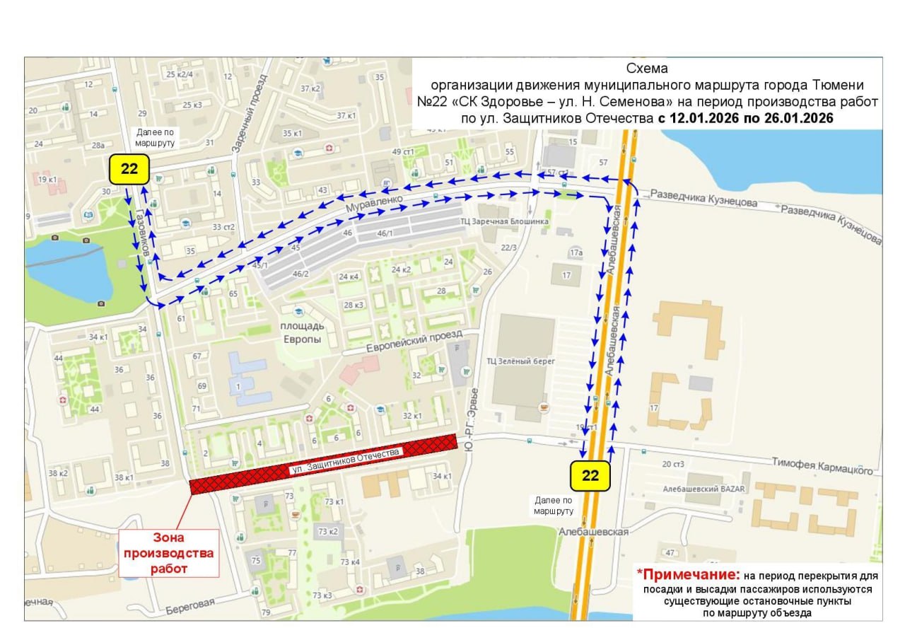 В период с 12 по 26 января 2026 года в связи с выполнением работ по ул. Защитников Отечества в районе перекрестка с ул. Газовиков маршрут № 22 будет следовать в объезд перекрытого участка со всеми существующими остановочными пунктами по маршруту объезда.