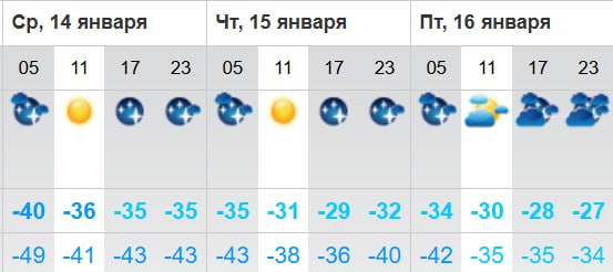 К слову, и в четверг тоже будет морозно: до -30...-32 градусов! В пятницу еще холоднее, до -34 градусов в утренние часы