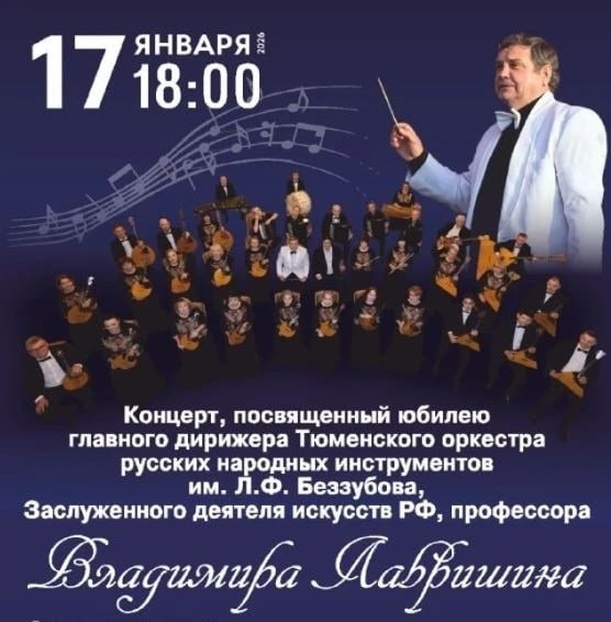 Приглашаем на юбилейный вечер главного дирижёра Тюменского оркестра русских народных инструментов им. Л.Ф. Беззубова, Заслуженного деятеля искусств РФ Владимира Лавришина.