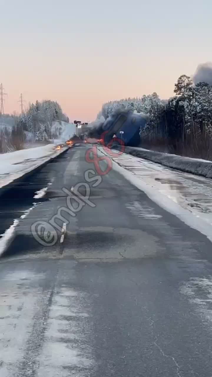 На трассе Тюмень - Ханты-Мансийск бензовоз столкнулся с фурой: транспортные средства полыхают