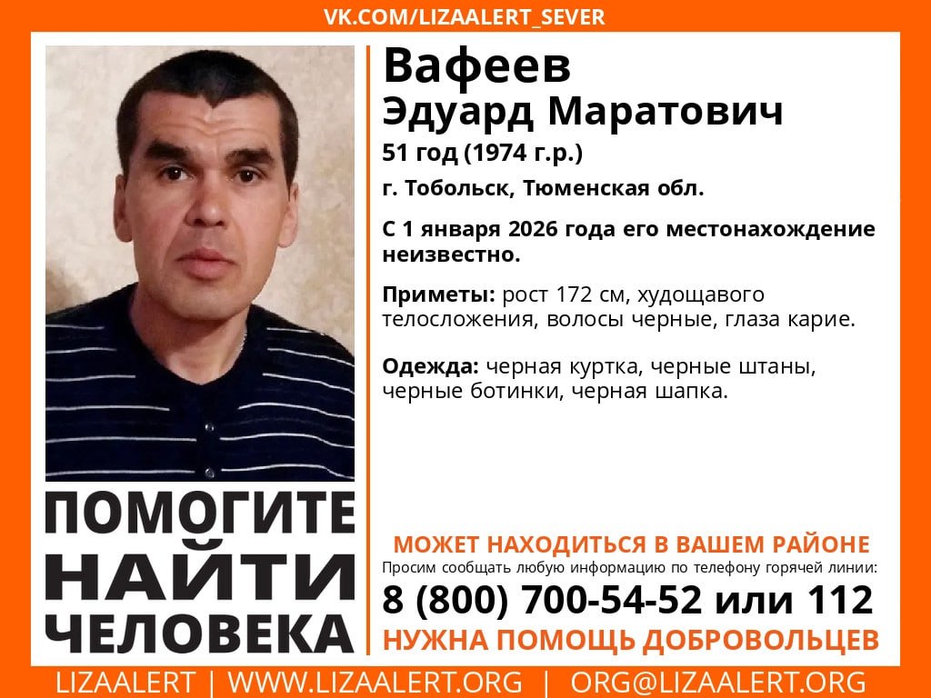 В первый день 2026 года исчез 51-летний тоболяк Эдуард Мафеев. Волонтеры отряда "ЛизаАлерт" разместили ориентировку на пропавшего