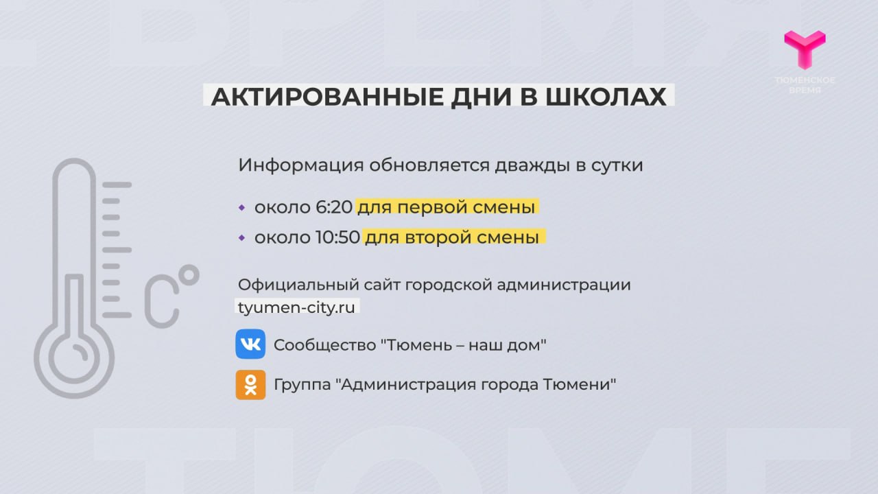 Информация об актировке появляется около 6 утра для первой смены и ближе к 11 часам для второй. Посмотреть её можно на официальном сайте городской администрации и на её официальных страничках в социальных сетях, а также в эфире телеканала "Тюменское время" и в наших аккаунтах в соцсетях.