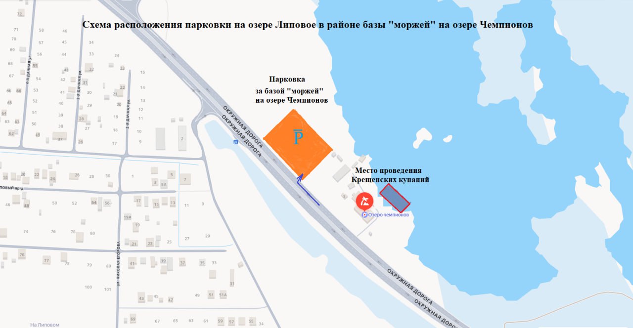 Вторая — на озере Липовое, 25-й км объездной дороги, у базы «Озеро чемпионов» время работы 18 января с 12:00 до 23:59, 19 января – с 08:00 до 23:59. Просторная парковка разместится за территорией базы «моржей».