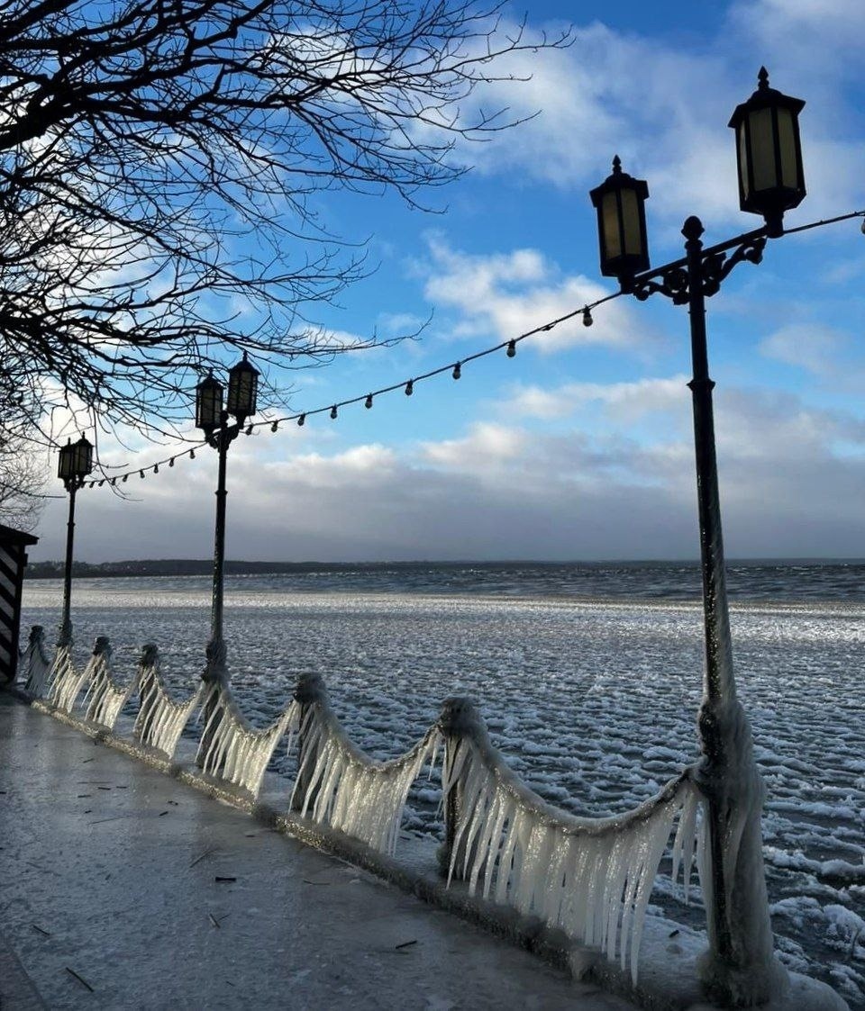 В эти выходные озеро оказалось под чарующим призраком зимы, и его красота не оставила равнодушными местных жителей. Сильные морозы и пронизывающий ветер превратили набережную в замерзший мир, а перила украсила блестящая гирлянда из сосулек, создавая атмосферу настоящей зимней сказки.