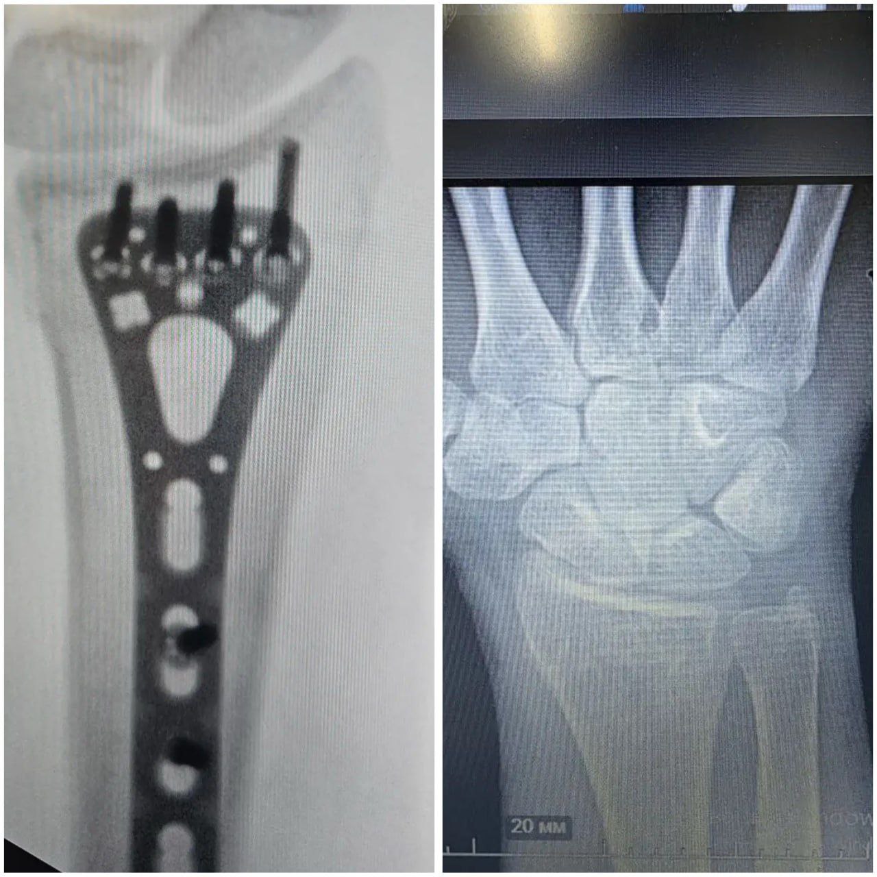 За весь период врачи провели уже более 1400 операций. Одна из пациенток попала на стол к хирургам после ДТП на мотоцикле. Она получила перелом лучевой кости со смещением. Для восстановления анатомии кости провели остеосинтез: зафиксировали ее фрагменты титановой пластиной и винтами, рассказал заведующий Центром реконструктивной микрохирургии кисти Иван Быркэ