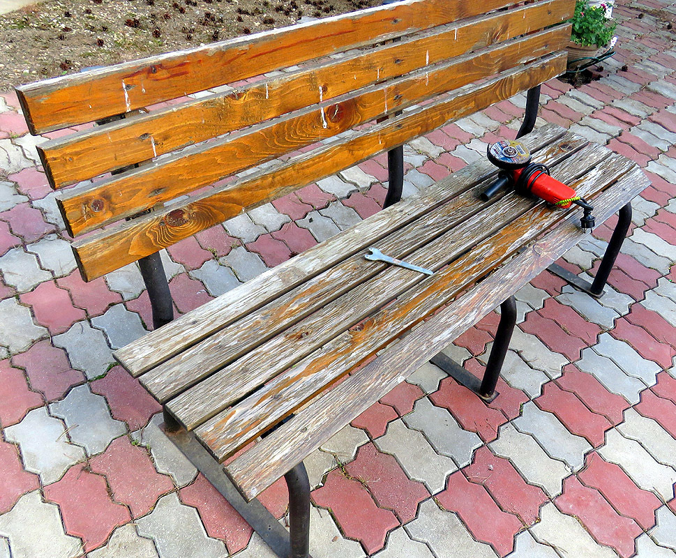 Сосед по даче, который тоже работает в офисе, поделился своей проблемой: старая садовая скамейка потеряла привлекательный вид, а покрытие стало местами облазить. После обсуждения, хорошей идеей стало использование тунгового масла, так как оно обеспечит надежную защиту. В одну из пятниц была взята банка масла с дачи, а также новый лепестковый диск для болгарки, чтобы заняться реставрацией этого изделия.