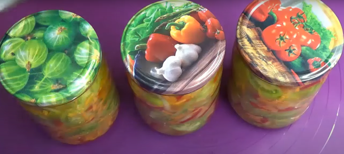 5. Наполнить стерилизованные пол-литровые банки салатом и залить маринадом, чтобы овощи были полностью покрыты.