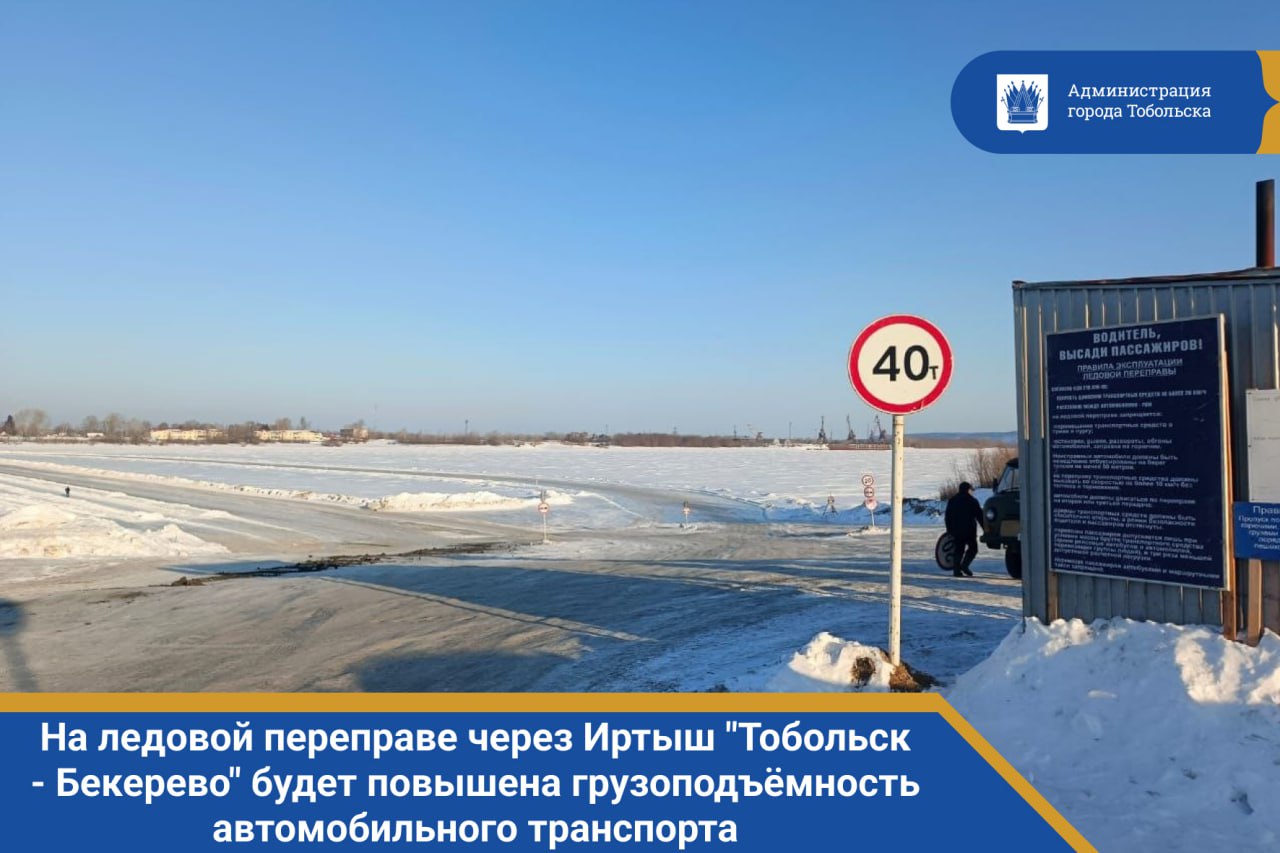 С 16:00 сегодняшнего дня на ледовой переправе через Иртыш "Тобольск - Бекерево" будет повышена грузоподъёмность автомобильного транспорта. Масса допускаемых машин — до 40 т.