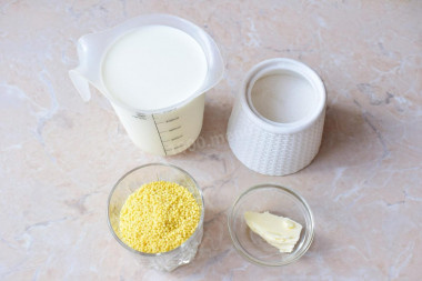 Молоко с сахаром и щепоткой соли доводят до кипения, после чего всыпают пшено и вновь доводят до кипения, помешивая.