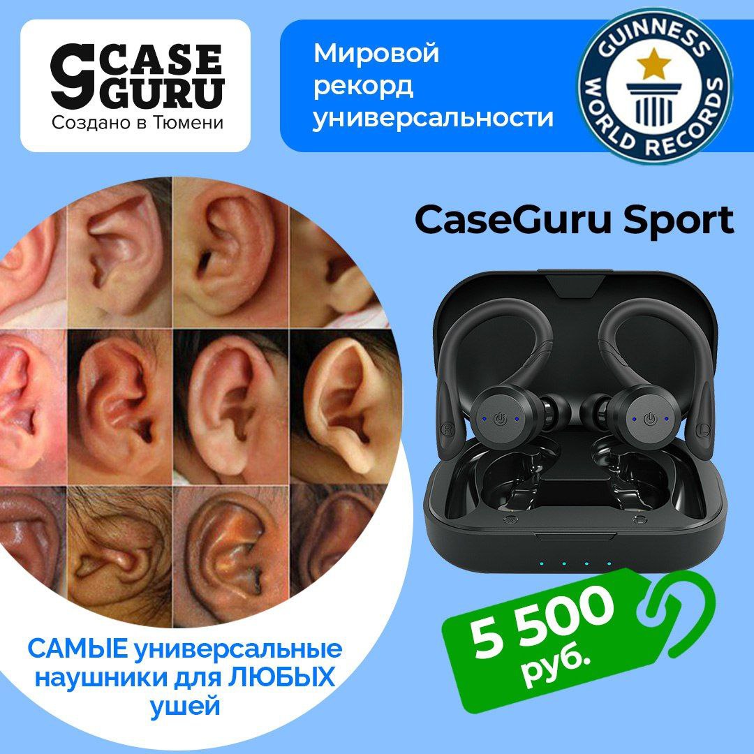 CaseGuru Sport – САМЫЕ универсальные наушники для ушей любой формы и любого размера. Благодаря 2 видам крепления – силиконовые распорки + заушные дужки – подходят для 98 различных типов ушей.