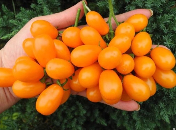 Этот сорт относится к индетерминантному типу и требует надежной опоры. Высокий куст, усердно формируемый в один стебель, стягивается к шпалере, чтобы каждый плод получил солнца. Плоды весом 10–15 граммов образуют длинные кисти, на которых таятся десятки ягод в светло-оранжевом тоне.