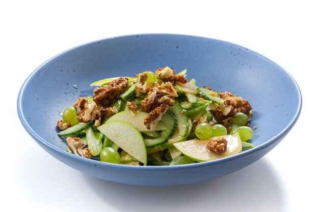 Салат держится на равновесии: яблоко и огурец добавляют сочности, сельдерей — ясную зелёность, а орехи дают характер. Карамелизированные орехи в сахарной карамели добавляют лёгкую глубину вкуса, не перегружая блюдо.