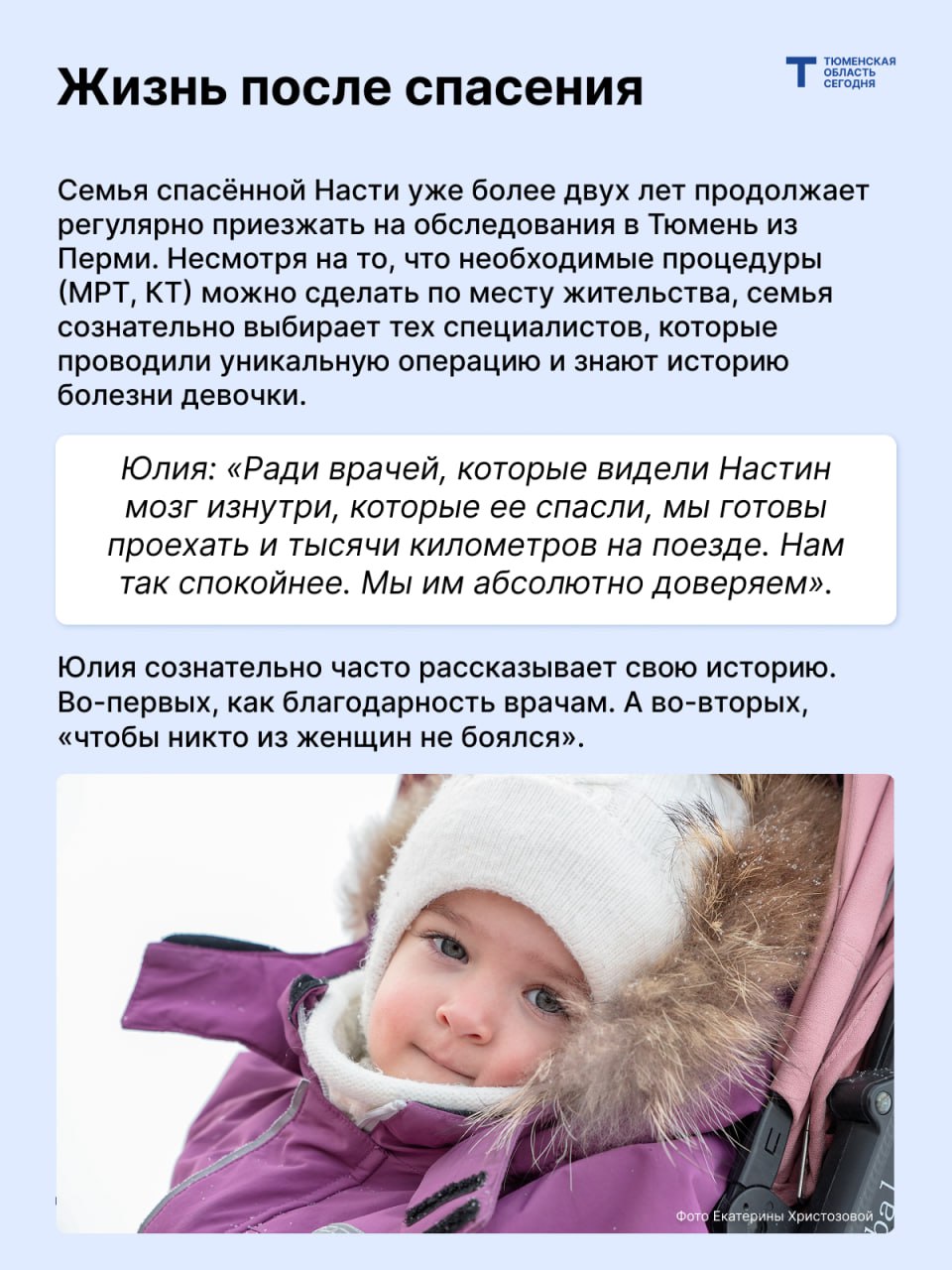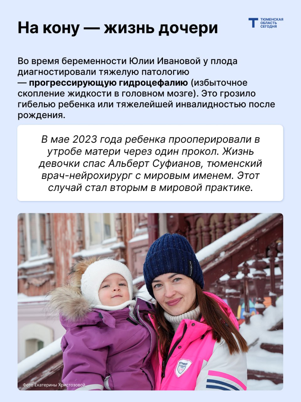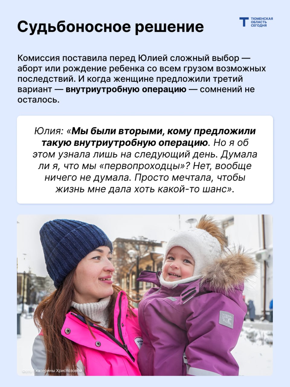 Так было у Юлии. Во время беременности ей сообщили, что у её будущей дочери почти нет шансов на нормальную жизнь. Но она не сдалась. Борьба за ребенка привела Юлию в Тюмень, к врачам, которые решились на уникальное вмешательство.